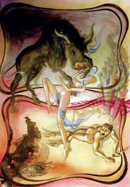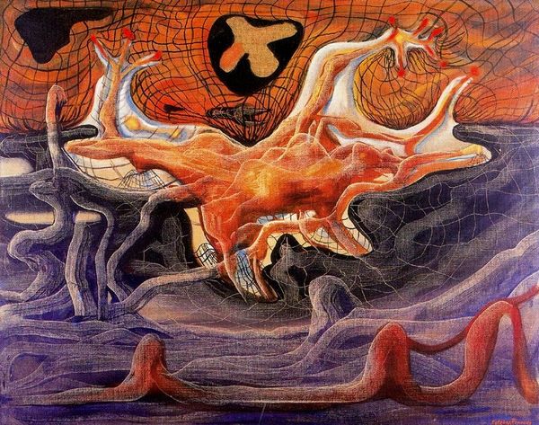 Editor: Here we have Lady Frieda Harris’s “Thoth Tarot,” painted around 1943 using mixed media including acrylic and pen. I’m struck by how dynamic the composition feels, with all these swirling, almost dreamlike, images contained within that central oval. What do you see in this piece, especially considering it's meant to be a tarot card? Curator: Well, aren’t tarot cards always such delicious little portals to alternate realities? When I look at Harris's work, I don’t just see a symbolic representation of a tarot archetype; I feel like I’m glimpsing a vibrant, pulsing moment of creation. The snake, for instance, that spirals around the figure – is it a force of temptation, wisdom, or simply pure, unbridled energy? Perhaps all of the above! And those somewhat menacing figures framing the central image… are they guardians? Traps? What do you make of them? Editor: They give me the feeling that accessing that central vision, the figure and the snake, requires confronting something potentially scary or unknown. Like there's a hidden element you can’t see until you face the images framing them. Curator: Exactly! Harris is playing with that very idea. It's that threshold, the boundary between the known and unknown that she so poetically captured. I'm not certain, but I find that Harris seems to be suggesting our realities, though bounded by limitations and the unseen, allow free flowing expression to arise with unlimited potential. Editor: I've never thought of tarot as modern art until now. Seeing those familiar symbols twisted in this abstract way has shown me a new way of interpretation. Curator: It is a marvelous lens, isn’t it? It really shifts your understanding doesn't it? Every time, I'm reminded that art, much like life, is ultimately what we choose to project onto it.