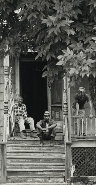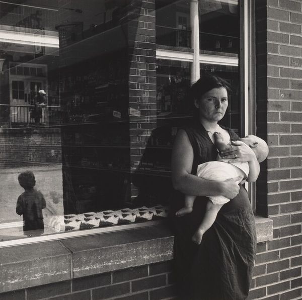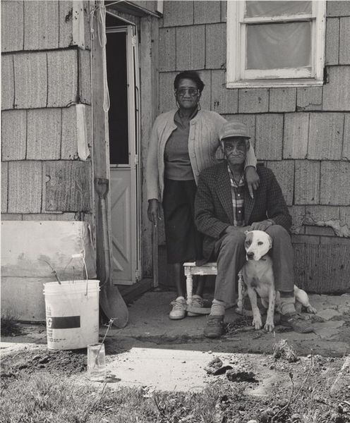 Curator: This arresting image is an Untitled work from Milton Rogovin's "Lower West Side series," taken in 1971. Rogovin used gelatin silver print to document communities facing economic hardship. What's your initial take? Editor: Stark. It’s the greyscale palette, the unflinching gaze of the subjects… they command your attention. There's a fascinating balance of light and shadow creating a layered effect. Curator: Rogovin saw himself as a social documentarian. He gave cameras to his subjects, empowering them to participate in shaping their own narrative, providing them agency within his practice, he was trying to capture a vanishing way of life shaped by deindustrialization and urban renewal policies. Editor: That's evident. Structurally, the composition is remarkably balanced. The figures are positioned asymmetrically yet anchored by the doorframe. Note the texture of the brick against the smooth surfaces within. The artist skillfully directs our eye, even incorporating that tiny ad sticker on the window! Curator: These photographs challenged established norms within fine art photography. They were viewed not as individual portraits but part of an ongoing social record that celebrated the lives and experiences of working-class families often ignored or marginalized. Editor: Yes, context is key. Looking closer at the clothing - the overalls, the open shirt – these sartorial choices tell a tale of place, era, class… consider also the way the female figure intersects the light, whilst the male one seems cast more into shadow – perhaps there is a story being told there as well? Curator: Absolutely. He directly confronted systemic inequality through the accessibility of his images. Rogovin created an archive which acted as a resource for activism and community self-representation at a key moment in urban development policy. Editor: Rogovin really does highlight an intrinsic dignity, there's an intimacy created by the pose, a familial quality and a sense of deep connection. Curator: Indeed, it goes beyond simple observation to forge a partnership. The image now offers us insight, a perspective from the past on pressing themes of community and resilience. Editor: It makes you wonder, what were their dreams? How do they see themselves reflected? Curator: Powerful questions to leave us with. Rogovin's approach invites us to continuously question the dynamics between artist, subject, and viewer. Editor: This photograph has more to offer than at first glance, and will likely draw me in many times over.