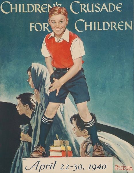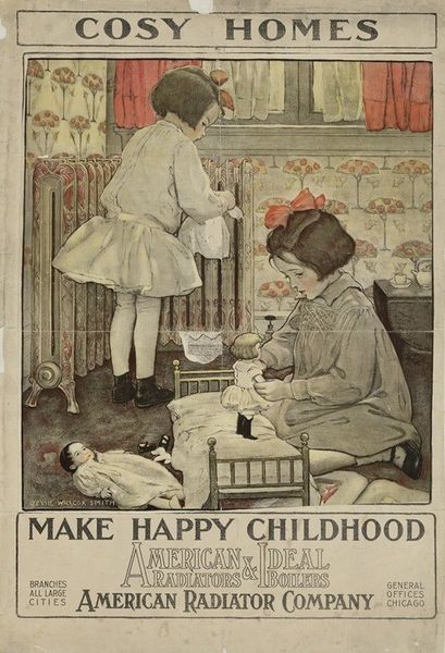 Curator: What strikes me first is the rather somber mood, particularly the downward gaze of the child holding the doll, and how the composition creates a sort of visual weight that feels heavy and still. Editor: The piece you're observing is the cover art for "Rhymes of Real Children" created in 1903, with illustrations by Jessie Willcox Smith. Smith was prolific, creating work for magazines and books during the Golden Age of Illustration. This piece, executed in watercolor, captures three children seated together. Curator: The use of watercolor gives the entire image a softened, dreamlike quality, almost as if we're viewing these children through a sentimental lens. But it is precisely that softness that contributes to this rather intense introspection radiating outwards from the artwork. Editor: Consider how the industrial production processes factor in. These images were intended to adorn mass-produced books aimed at children and families, reflecting specific cultural values of the era. Smith’s commercial success points to her effective navigation of market demands while maintaining a signature aesthetic. Curator: The composition draws my attention to the contrast between the dark, serious expressions and the lighter colors of their clothing. Note also how these figures arranged side-by-side contribute a narrative about childhood itself. Each child seemingly absorbed in his or her thoughts. This intimate staging contrasts starkly with the large typeface, hinting that childhood should always be given attention. Editor: Examining the cover’s materiality also extends to its role in child socialization and domestic culture. The availability and consumption of illustrated books influenced expectations of children's activities, gender roles, and behaviors. Were those expectations of reality met in society, one might ask? Curator: Certainly a fascinating point regarding society meeting a real representation of its "real children". I think one would need to really consider the symbolism imbued in their expressions. What it all represents. Editor: Yes, reflecting on those expressions brings a fresh, nuanced perspective to the work. Curator: It truly does! It’s been enlightening to consider its intrinsic elements within such a broad societal framework.
