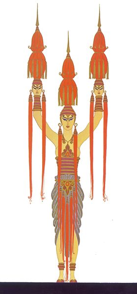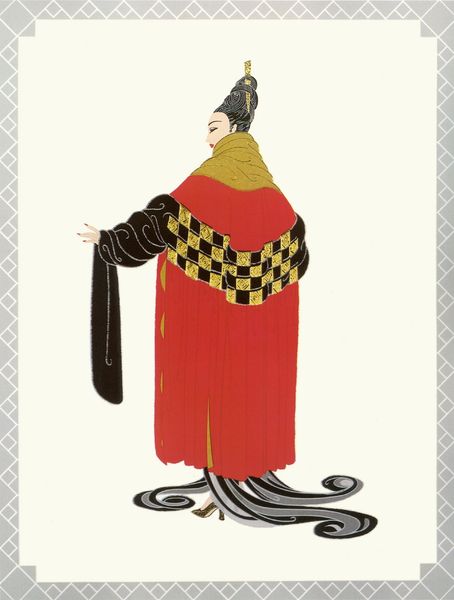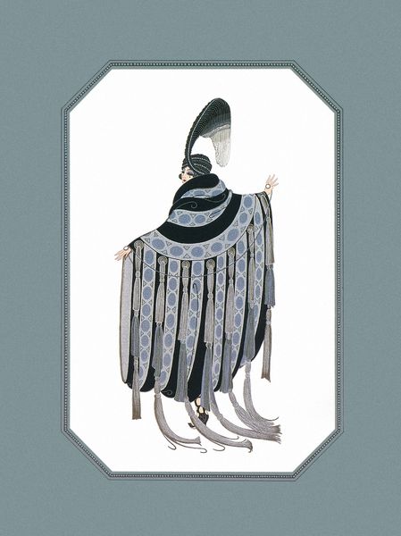 Curator: Look at this captivating image, "Costume for Gaby Deslys," by Erté. It’s a beautiful rendering using ink on paper, showcasing his incredible skills in fashion and textile design. Editor: Oh, my! What strikes me first is its theatricality. It's like a captured moment from a lost film reel. The drama! The glamour! Curator: Indeed! Erté's works often depicted powerful, fashionable women, embodying the Art Deco movement. The subject, Gaby Deslys, was a celebrated dancer and actress of the time, known for her flamboyant style. This piece provides insights into the performative aspects of celebrity, but also gendered performance. Editor: That headdress! It's almost defying gravity. I love the monochromatic palette too, the stark blacks and whites, accented with these hints of muted greens and golds on the tassels, somehow feel both elegant and subversive. Don't you think it has that surreal air, a kind of playful melancholy? Curator: Yes, absolutely. And those long, elegant lines – they speak to the streamlined aesthetic of the era, a rejection of the past and an embrace of modernity. Moreover, it highlights the cultural intersection between fashion, theatre and visual culture, crucial to understanding early twentieth-century popular culture. The design could be considered to reinforce stereotypical visions of femininity; or, maybe even, to push against the boundaries of this archetype by making it larger than life and spectacular? Editor: Hmm, that's fascinating! I see it differently perhaps. Those tassels, for me, aren't just decoration. They seem to give the character motion. They add such flair! The outfit has almost come alive as though she is dancing. Curator: Precisely. And Erté, through pieces like this, engaged with complex themes around celebrity image-making and consumer culture during a transformative time. His work raises important questions regarding the role of performance in shaping public perception and personal identity. Editor: I could just stare at it all day, picturing that era. Thanks, that was enlightening. Curator: Indeed, a dance into the past.