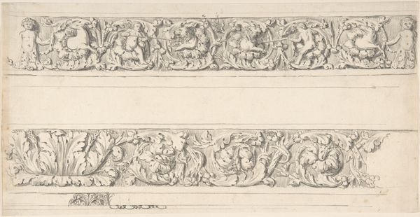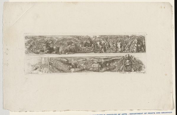 Editor: This is "Plate 9," an etching by Stefano della Bella, created around the 17th century. It feels very classical in its subject matter, like something you'd see on a frieze. What strikes me most is the artist’s command of line; how does one even begin to interpret the composition of this engraving? Curator: The composition hinges on a sophisticated manipulation of form and space. Note the horizontal format, segmented into registers, echoing classical relief sculpture, a point you rightly observed. Della Bella uses the linear quality of etching to create both detail and depth. The primary register, populated by figures in dynamic motion, contrasts with the register below populated with static animal forms, does it not? Editor: I see the division. There's a real tension between movement and stillness across those two registers, the figures in the top panel versus the reclining creatures below. It gives the piece a unique rhythm. Curator: Precisely. This interplay generates a visual cadence. Observe also the use of negative space. Della Bella skillfully uses the white of the paper, that toned paper you referenced, to define forms, adding dimension, but equally as an activation of plane, as foreground and background compete, wouldn’t you say? Editor: So the 'empty' space is as crucial as the lines themselves in creating the overall effect. Is there anything particularly interesting about the symmetry, or lack thereof? Curator: Ah, the symmetry is a deliberate choice to avoid monotony. A strict symmetrical arrangement might flatten the image, while the asymmetry, subtle though it is, infuses energy and contributes to a more visually dynamic, if eccentric, presentation, giving life to the composition, no? Editor: That makes a lot of sense. I hadn't considered the dynamic aspect of asymmetry here. Thank you for helping me see it with fresh eyes. Curator: The pleasure was mine. Approaching artworks from the sole point of formal structure always presents novel vantage points.