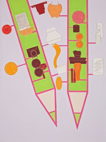 Alfio Giuffrida’s painting, "Eingangstore Exp4," presents us with a cool, pale blue canvas, bisected by a maroon doorway frame. On either side, vertical structures emerge, each adorned with carefully rendered objects. The composition is strikingly symmetrical, yet filled with enough variance in colour and form to catch the eye. The painting's semiotic play lies in its arrangement of everyday items into symbolic structures. Giuffrida teeters on the edge between the functional and the aesthetic. The doorway, an archetypal symbol of transition, becomes a threshold to question our preconceived notions of value and order. The pale background emphasizes the objects, turning ordinary domestic items into artifacts worthy of contemplation. These objects, seemingly arranged at random, prompt us to consider how cultural meanings are constructed through selection and placement. Giuffrida's work uses a formal visual language to invite an examination of the sign systems that subtly govern our perception and understanding.