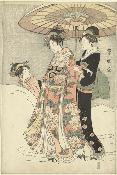 This print, "Snowball", was made by Utagawa Toyokuni II in 19th-century Japan using woodblock printing, a quintessential example of the *ukiyo-e* tradition. The materiality of the print significantly influences its aesthetic. The texture of the paper, the delicate color palette, and the linear quality are all intrinsic to the medium. Each color requires a separate block, demanding meticulous carving and registration. Look closely and you'll see the slight misalignments, and variations in ink density. The process involves a collaboration between the artist, the carver, and the printer, each bringing unique skills to the final product. These prints were not considered 'high art' at the time. *Ukiyo-e* prints were products of a thriving commercial culture, made for a broad urban audience. They were relatively inexpensive and mass-produced, a far cry from the unique, handcrafted objects of the aristocratic class. The labor-intensive process of woodblock printing highlights the democratization of art in Japan at the time, and the commercial forces at play. By understanding the materials, processes, and social context of this print, we appreciate it beyond its decorative appeal. We understand the significance of *ukiyo-e* within a wider social and cultural landscape, which challenges conventional distinctions between art and craft.