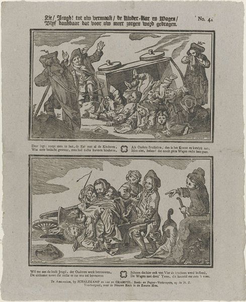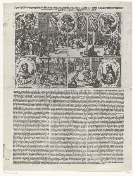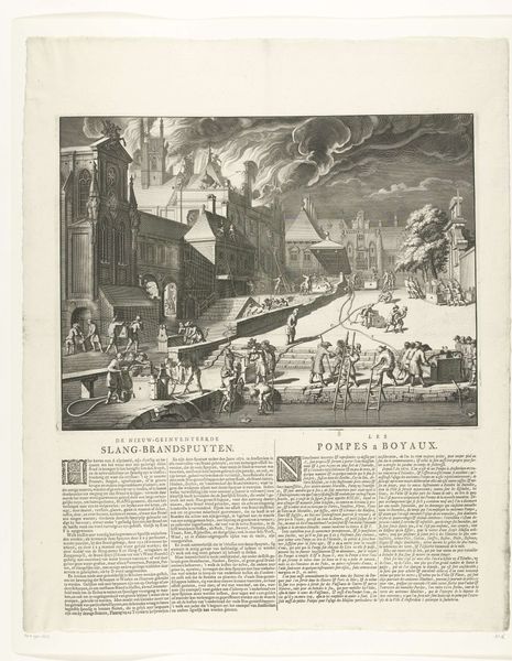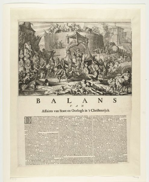 This anonymous newspaper article from 1929 at the Rijksmuseum, is made with ink on paper. It depicts the Battle of Lekkerbeetje from 1600. The image at the bottom is an etching or engraving made up of thousands of tiny lines that together describe a scene of chaos and movement. The texture of the paper, its yellowed tone, creates a feeling of age and history. If you look closely at the battle scene, you can see how the artist used these tiny lines to create a sense of depth and atmosphere, the mass of soldiers in the foreground with a lighter, less defined landscape in the distance. This reminds me of how some painters like to build up layers of paint to create texture and depth, a process of adding and subtracting, revealing and concealing. The choice of monochrome is interesting, because it emphasizes the starkness and drama of the scene. It makes me think of Francisco Goya's etchings "The Disasters of War," which also use stark black and white imagery to depict the horrors of conflict. Like Goya, the artist here is using the print medium to create a powerful and lasting statement about war.
