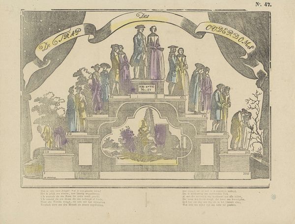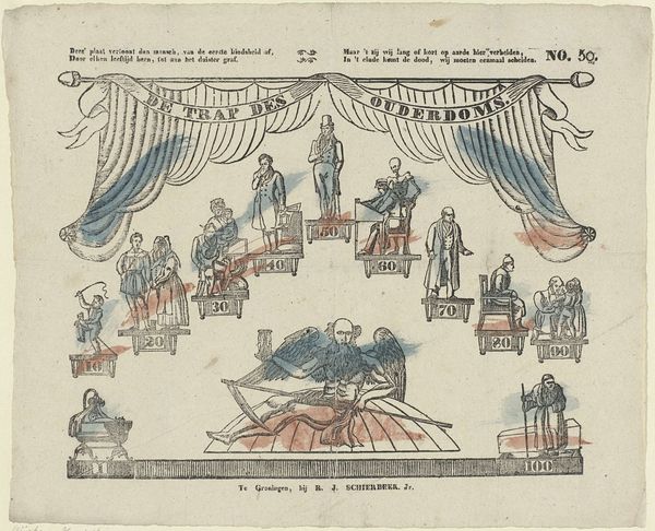 Curator: This is "The Stairway of Old Age" created by Lutkie & Cranenburg between 1848 and 1881. It's a lithograph, a print. The overall mood feels a bit…storybook-like, even though it depicts aging. The figures ascend these numbered platforms until they meet what I assume is death at the bottom. What jumps out to you? Editor: I'm struck by the commercial nature of the print; it's almost like a board game about the stages of life. The medium feels significant here - it’s not an oil painting meant for a wealthy patron, but a widely reproducible lithograph. What does that materiality tell us? Curator: Exactly! Consider the lithograph’s production, enabling distribution to a broader, middle-class audience interested in moralizing narratives. Its function lies in accessibility. Notice the assembly-line character of the image, almost like a flowchart; does that make you consider the division of labor that may have been required for mass producing this work? Editor: That's fascinating! I hadn't thought about the labor aspect, but that makes sense. Was this sort of allegorical print a common product of the printing press, catering to certain sensibilities of the masses? Curator: Yes. The commercial element can’t be overlooked. How it was distributed is a central concern. We are looking at how consumer demand drives not just artistic creation but shapes its accessibility to varied social stratifications, what thoughts does it evoke concerning accessibility versus elite art? Editor: I never considered a piece of art, as something akin to mass media, and its accessibility for everyone. Thank you for your insightful perspective. I am forever changed, in considering materials and labour!