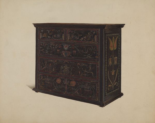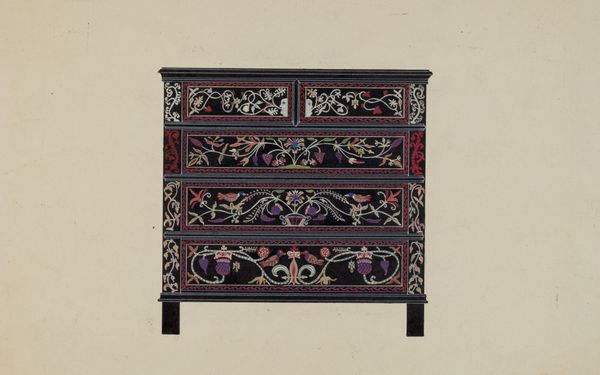 Martin Partyka painted this Guilford Painted Chest, sometime between 1855 and 1995, and I get the feeling he really enjoyed the process. It's like the whole thing is alive with these tiny little marks, dancing across the surface. The red is so punchy, like a string of firecrackers against that moody, dark ground. Look closely, and you'll see how the paint isn't trying to hide anything. It's not about illusion, it's about the realness of the gesture, the hand moving, the brush touching. The decoration on the draws is made up of individual elements with a looping, rhizomatic line connecting them all. It almost looks like embroidery. And that reminds me of another artist, Elizabeth Murray. Like her, Partyka, seems to play with the ordinary in a really extraordinary way, turning a humble chest into a whole universe of pattern and color.