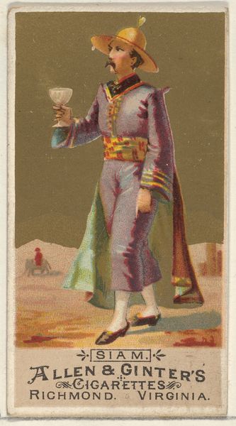 Editor: Here we have “Siam, from the Natives in Costume series,” printed between 1886 and 1900 by Allen & Ginter. It’s a drawing and watercolor print featured on a cigarette card. I find it quite stylized; what's your take? Curator: The card's materiality itself speaks volumes. These cards were mass-produced, using relatively cheap materials like cardstock and simple printing techniques, reflecting industrial production processes. What does the subject matter – a supposed “native” of Siam – tell us about the consumer culture of the time? Editor: Well, it seems like this image played into the exoticism that was popular then. Was it purely for entertainment or were there other motives? Curator: Exactly. The Orientalist style is important, reducing complex cultures to simplistic, often inaccurate visual shorthand for commercial purposes. How does that relate to labor practices and commodity production? The labor involved in growing the tobacco, manufacturing the cigarettes, and even printing these cards should also be considered, all part of a global economic network. Editor: That's interesting. So, you're saying the image is only one piece of the puzzle; that we need to consider everything involved in the cigarette's production? Curator: Precisely. Examining the manufacturing and global distribution of something as small as a cigarette card opens a lens onto the relationship between labor, commodity culture, and the exoticization of other cultures. It wasn't just “entertainment.” It’s part of a larger system. Editor: I never really considered all that went into something like this. It's given me a totally different way to approach understanding artworks. Curator: And that’s precisely what understanding the materials, manufacturing process, and social context enables us to do; art exists within a system.