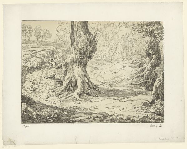 Curator: This etching, entitled "Heuvel met poort," or "Hill with Gate," was created by Frederick Bloemaert sometime after 1635. Editor: My initial impression is one of foreboding. There's a stillness, a quiet menace almost, in this sparse landscape. The gate-like structure at the summit… is it a gallows? Curator: It very well could be. Bloemaert worked during a period of intense social and political upheaval in the Netherlands. Consider the historical context. Public executions were not uncommon. This piece may allude to that atmosphere of social control and the ever-present threat of violence faced by marginalized communities. Who held the keys to such gates? Editor: From a formal perspective, I'm struck by how the artist uses line. The etched lines are delicate, yet they create a strong sense of volume, especially in the way he renders the hill itself. It rises sharply, dividing the scene into distinct areas, focusing your gaze. Curator: Absolutely. And the figures within that landscape reinforce the sociopolitical narrative. There is a class distinction—a hierarchy. Two figures are posed idly at the lower left, with another scrambling up the slope on the right side of the image. What are they reaching toward or fleeing from? Bloemaert utilizes that stark contrast between light and shadow to highlight inequality. Editor: Yes, there’s an unresolved tension between light and dark. Look how the light catches the bare branches, drawing attention to the imposing structure at the summit, while the shadowed base seems to obscure any possibility of a clear narrative. This strategic use of chiaroscuro guides the eye, building drama and highlighting thematic elements. Curator: Indeed. This landscape can also be interpreted through an ecological lens. The skeletal trees suggest a barren, perhaps exploited landscape. Considering contemporary debates about environmental justice, it provokes thought about the long-term effects of power structures on our shared earth. Whose land are these figures treading upon, and at what cost? Editor: Well, it appears our conversation reveals how the composition can reveal both personal expression and socio-historical meaning embedded in the imagery, rewarding viewers from multiple perspectives. Curator: Ultimately, the artwork encapsulates not just an image but the echoes of an epoch defined by transition, uncertainty, and struggles against oppressive order. Thank you.