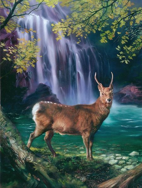 Editor: "In the Cool Shade" is an oil painting by Julie Bell that depicts a deer resting in what appears to be a forest clearing. It's really beautiful but kind of subdued, I think, with soft colors. How would you interpret this work, and perhaps, place it in a broader art historical context? Curator: It’s fascinating how the artist captures this animal, particularly when we consider the shifting relationship between humans and nature throughout art history. Think about how representations of animals evolved—from symbolic creatures in religious iconography to studies of natural history and then, increasingly, to reflections on ecological concerns and the sublime. Editor: Right, so this isn't just a pretty picture of a deer, it's connected to bigger conversations. Do you think the realism style Bell employed has a particular purpose within this historical view? Curator: Exactly. Realism can function as a way to highlight both the beauty and vulnerability of the natural world. Artists in the genre frequently challenged academic art traditions. The question then becomes: does the intimate depiction challenge or reinforce human dominance over nature? Editor: I never thought of it like that. Considering how much wildlife is impacted by human encroachment, it adds a layer of meaning. Curator: It does, doesn't it? This brings to mind contemporary ecological anxieties, doesn’t it? Art provides ways to grapple with those fears. Editor: I'm beginning to see that studying paintings like this can actually help us understand larger historical and social themes. Curator: Absolutely. It is an interesting approach, connecting the personal with the political, art can truly expand our viewpoint.