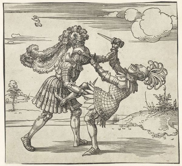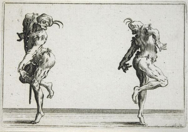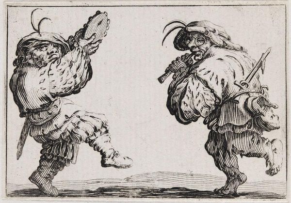 Curator: Here we have "Dancers with Flute and Tamborine," a lively etching by Jacques Callot, made sometime between 1592 and 1635. Look at the dynamic energy packed into such a small space, only about 5 by 8 centimeters. Editor: My first thought? Mischief. It feels like a scene from a chaotic street performance, or maybe a dream sequence. The figures seem…almost manic. Curator: Callot was a master of capturing the commedia dell'arte spirit. Notice how he uses line to suggest movement and texture. The intricate costumes, the exaggerated gestures… Editor: And the way the light seems to bounce off the tambourine! I'm fascinated by the cross-hatching, especially on the flutist’s sleeves. It's almost overwhelming, like musical notes spilling off the page. Curator: I always find myself wondering what the musician is looking at! Editor: Agreed. It's a whirlwind, isn't it? A tiny, perfectly rendered moment of joyful pandemonium.