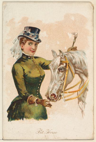 Editor: This lithograph from 1891, titled "Pet Deer" by William S. Kimball & Co. is rather striking. The deer almost blends in with the woman's attire. I am fascinated by the deliberate interplay between human artifice and the natural world. What compositional elements stand out to you? Curator: Notice the artist's calculated deployment of line. The etched outlines, combined with the chromatic harmony of soft pastels, engender a dreamlike state. Consider also the structural mirroring within the composition: the curves of the hat echoing the antlers. Do you perceive any intentional geometric structure at play here, providing visual cohesion? Editor: I see how the curve is a repeating element. Is there something to the flat, almost graphic style of the figures? Curator: Precisely. The flattening of form enhances the picture’s self-conscious artifice. The limited palette reinforces a unified field. Observe how the eye is led through the tableau, primarily along deliberate vector paths traced through tonal gradations and calculated symmetries. Consider the effect created by the subject’s gaze; where does it lead the viewer? Editor: Her gaze is definitely fixed on the viewer, inviting us in, and echoing in the direct gaze of the deer. So, the figures' pose contributes to the construction of a particular visual dynamic. Curator: Indeed. This controlled arrangement allows for a particular reading, an engagement rooted not in verisimilitude but in aesthetic contemplation. By understanding these formal components, we enrich our appreciation of the artistry involved. What has struck you most about this lithograph upon closer examination? Editor: That understanding the visual grammar unlocks more than initially meets the eye. Thanks for pointing out these intricacies, the focus on composition is deeply appreciated!