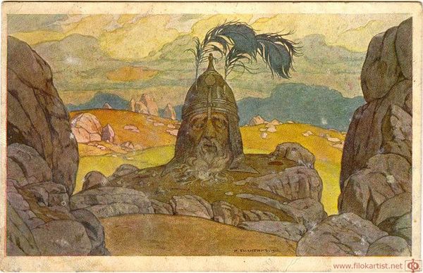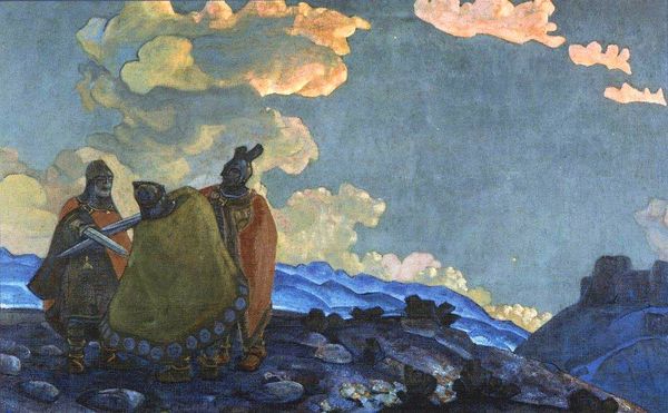 Editor: We’re looking at “Mikula Selyaninovich,” an oil painting by Nicholas Roerich from 1909. The color palette is very muted. There’s a man with a horse in a hilly, almost dreamlike landscape. What do you see in this piece? Curator: I see Roerich tapping into deep veins of Russian cultural identity at a time of great upheaval. The painting isn’t just a representation of a mythical hero, Mikula, a strong peasant farmer. It speaks to the idealization of rural life, of indigeneity, and the spiritual power of the land in the face of encroaching modernity and social stratification. Consider how the figure seems integrated into the landscape, a symbol of national strength rooted in the earth. Editor: So, it’s more than just a mythological scene. It has a socio-political context? Curator: Absolutely. The Russian avant-garde was deeply intertwined with nationalist sentiments, often looking to folklore and peasant traditions for authentic cultural expression and resistance against western cultural domination. How does Roerich’s use of color, almost monochromatic, contribute to that feeling of a deep historical connection? Editor: I see what you mean. The limited palette, mostly blues and browns, makes it feel timeless, like a memory. Curator: Exactly. And Mikula himself wasn’t just any peasant; he was mythically strong. So, Roerich presents this connection to the land as a source of not just cultural identity, but strength, echoing calls for national and social revival rooted in traditional values. The Russian avant-garde aimed to connect modern art and design to traditional folk art, elevating craftsmanship while challenging hierarchies. Editor: That's fascinating! I hadn’t considered the political undercurrent. I was just thinking about it as a pretty picture of a legend. Curator: Art is rarely "just" anything, is it? Seeing art through an activist lens means understanding that it’s always participating in broader conversations about power, identity, and social change, even when it seems to simply depict a landscape or a myth. Editor: I’ll definitely look at art differently now. Thanks for opening my eyes!