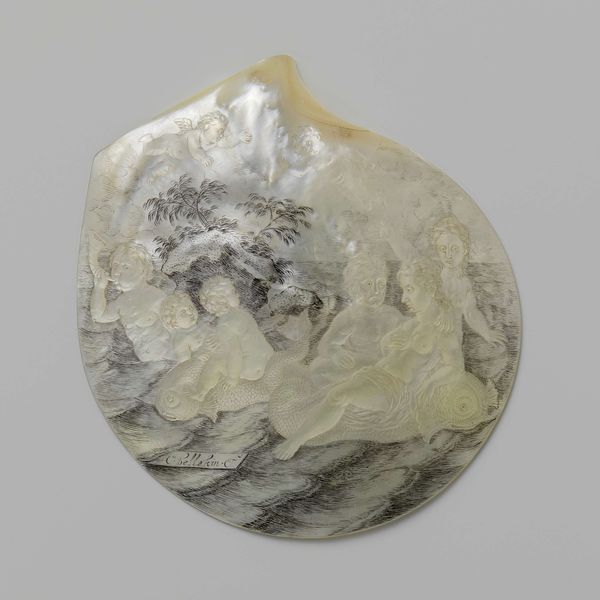 Curator: Here we have a remarkable example of Baroque carving: an oyster shell, dating from around 1700, meticulously worked by Cornelis Bellekin. Its official title is "Oesterschelp met zeefiguren, waaronder een vrouw op een rijdier"—Oyster shell with sea figures, including a woman on a mount. Editor: My goodness, what an enchanting scene! It's ethereal and almost ghostly. All these figures emerging from the pearlescent shell – are they riding dolphins, or some kind of fantastical sea creatures? It feels very dreamlike. Curator: Absolutely. Shell carving was quite the fashionable novelty during the Baroque period, appealing to wealthy patrons keen on displaying luxurious and exotic curiosities. Think of it as a cabinet of wonder shrunk into a single, transportable artwork. The very act of carving something so delicate, so ephemeral, would have spoken volumes about wealth and mastery. Editor: I'm immediately thinking about how these playful images interact with contemporary concepts of femininity. I mean, who is that central figure? Are we supposed to see her joyride as celebratory, or is it more of a power play? A claim to domain and mastery within this marine realm? Curator: That’s a brilliant question. Bellekin, of course, was working within a heavily codified symbolic language. Think of the popularity of marine mythology and allegorical themes featuring powerful female figures associated with the sea—think Amphitrite. I believe that looking at the work from a genre-painting perspective, we can start to imagine Bellekin was creating an intricate, sophisticated status symbol. Editor: Right, it's tempting to interpret the imagery as empowering—these confident female figures commanding mythical beasts. But we can't ignore the power dynamics at play within the cultural elite commissioning this artwork and the often obscured or subjugated labour producing it. It provokes essential conversations on identity, gender, and artistic representation. Curator: Indeed, and looking closely, it prompts me to consider not just who the intended audience was, but the complex power dynamics in both accessing the raw materials and finding the skilled artisans capable of executing such detailed craftsmanship. It's a material history interwoven with social hierarchies. Editor: This shell encapsulates such complexity. It's more than just pretty faces and frolicking figures; it's a small window into Baroque social and artistic norms. Thank you, that’s certainly enriched my understanding of this sculpture. Curator: Likewise, the perspective offered really opens my eyes, too. This really reveals what an oyster shell has to offer us beyond its shimmering surface.