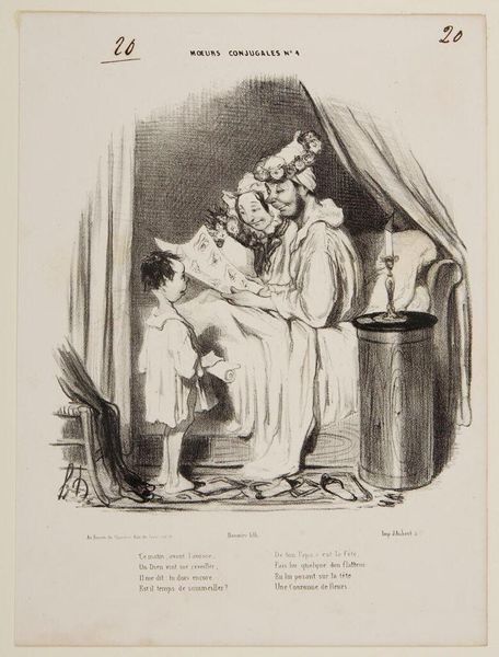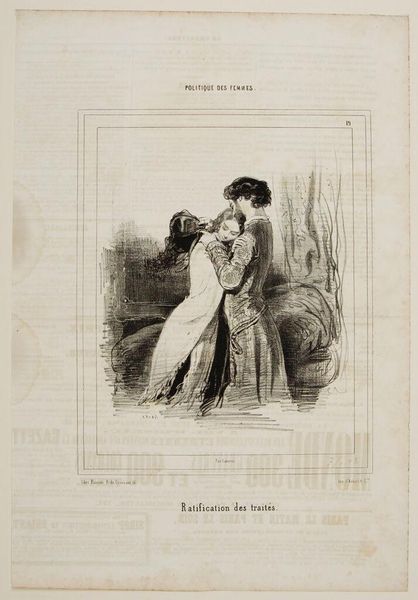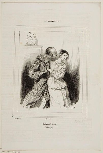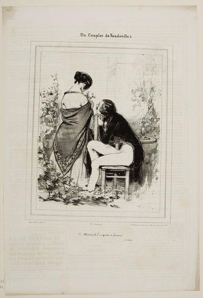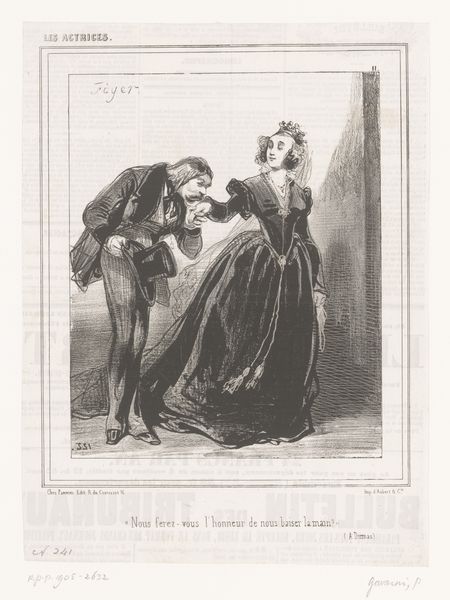Editor: This is "Will you do us the honor of kissing our hand?" by Paul Gavarni, although the date is unknown. It looks like a lithograph. The figures seem awkwardly posed, almost like a stage set. What stylistic elements stand out to you? Curator: Indeed. The interplay of light and shadow, meticulously rendered, defines the forms. Note the stark contrast, almost theatrical, highlighting the textures of fabrics and the contours of the figures. The composition is self-contained, drawing focus onto the central interaction, yes? Editor: Absolutely, the stark contrast emphasizes the formality of the gesture. It’s all quite contained. Thanks! Curator: Precisely. It encourages us to decode the visual language employed, revealing Gavarni’s acute attention to detail.