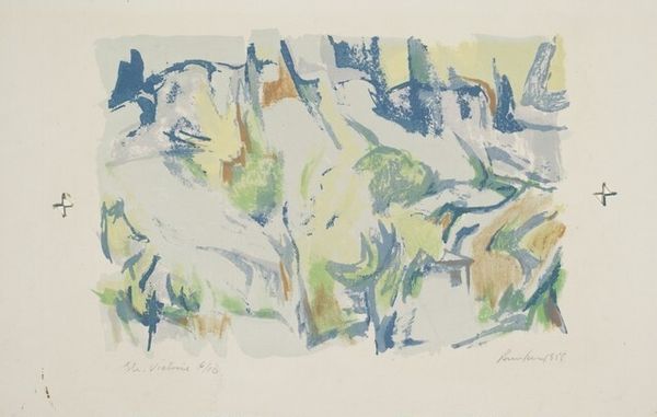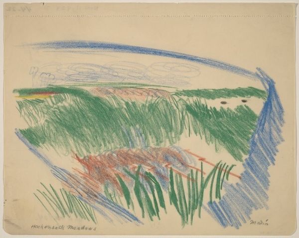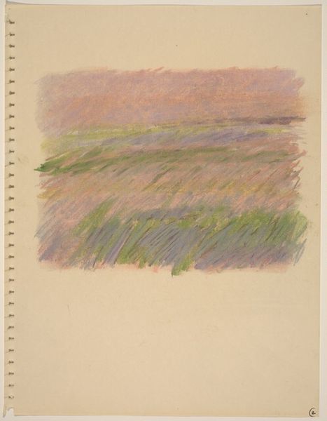 Editor: Here we have George Bunker's "Untitled" drawing from around 1973, made with pencil on paper. It strikes me as quite delicate, almost dreamlike with its soft colors and abstracted forms. What do you see in this piece? Curator: This work whispers rather than shouts, doesn't it? I see it as a reflection on the fleeting nature of landscapes and perhaps even memory itself. Looking at the artistic movements of the time, artists were engaging with abstraction as a way to challenge established societal norms. How might we connect Bunker’s abstracted landscape to broader themes of environmentalism, considering its rise in the early 70s? Editor: That's a fascinating point! I hadn’t considered it in that context, but seeing it now, I wonder if the abstraction speaks to a fragility, the landscape slowly fading or being overtaken. Do you think that the pastel palette choice contributes to the mood of the piece? Curator: Absolutely. Colors are never neutral; they carry cultural and historical weight. These muted pastels soften the traditional representation of nature, pushing against idealized landscapes often depicted as vibrant and fertile. Perhaps Bunker is suggesting a more vulnerable relationship between humans and their environment. Can we, as viewers, reclaim our role in the face of what we see happening to the Earth, even today? Editor: I like the activist position you're bringing to the analysis of this landscape and it invites viewers to question their responsibilities, as you said. I'm leaving with a completely new understanding of Bunker's drawing. Curator: It’s in these dialogues that we reveal how art not only mirrors society but has the capacity to shape and question it too. Hopefully others see the drawing in this new way.
