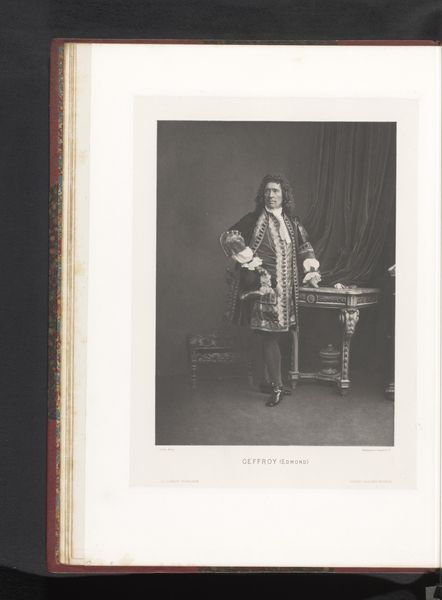 This print captures Léopold Barré in character, its existence predicated on performance and spectacle. It was made using photography, a relatively new medium in the 19th century, which democratized image-making. Photographic prints like this one made it possible to reproduce images and disseminate them widely, influencing society. The subject’s elaborate costume, with its complex ornamentation, speaks to the labor required to produce it. From the lace collar to the intricate brocade of the coat, the clothing signifies status and wealth, made possible by skilled labor. Consider the social context of this image, where photography, theater, and fashion intersect. This image straddles the line between documentation and artistry, inviting us to consider how the materials and processes used in its creation reflect broader cultural values and hierarchies. Ultimately, understanding the making and context of this print enriches our appreciation, challenging any separation between art, craft, and social history.