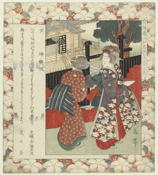 Editor: So, here we have Yashima Gakutei's "Haas: Kamejima," a woodblock print from around 1827. The delicate floral border really frames the central image, softening what could otherwise feel like a very stark scene. What are your initial thoughts on the structure and composition here? Curator: A curious visual construct, isn’t it? The initial observation leads me to the use of planes: the floral border acts as a sort of decorative proscenium arch, and this is clearly contrasted with the geometric structure of the bridge which bisects the figuration and the background. What purpose could be ascribed to this contrast in structure? Editor: Hmm, maybe it's highlighting a sense of transition? Like the figures are poised between different states or spaces? The rigid structure seems to confine them. Curator: Precisely. Let's focus on the treatment of line in Gakutei’s woodblock, particularly the manner by which the contours are defined. Notice the almost diagrammatic approach in rendering the architectural features, a marked contrast to the more fluid execution of the figures' robes. Consider how this interplay guides our gaze and potentially contributes to the overall dynamic. Editor: I see what you mean. The almost blocky lines in the houses and bridge compared to the flowing lines in the figures' clothing creates a definite contrast, almost highlighting the central figure as being organic versus the artifice of structure. Curator: Exactly. It is not about surface imitation of life, but to investigate visual vocabulary for cultural value and philosophy. Editor: That is fascinating. Thanks for the insight! Curator: Indeed, a beneficial exchange of perceptions. I am intrigued to think further on it.