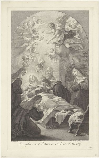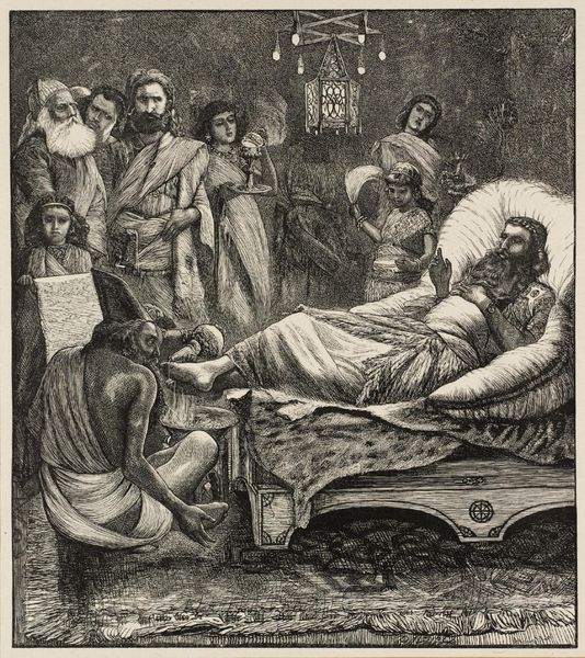 Curator: What strikes me immediately is the strong contrast between the earthly mourning and the celestial hope depicted. The artist's precise rendering creates a powerful scene of both loss and anticipated redemption. Editor: Indeed. The work before us, "Illustration til Fabricius' Danmarks historie," created in 1853 by H.C. Henneberg, is a woodcut that captures a pivotal moment laden with historical and cultural weight. It resides here at the SMK, Statens Museum for Kunst. Curator: And consider the subjects present: the women who seem to represent passing of tradition to younger generations, while also presenting the idea of familial representation. Editor: Let's not forget the overall design. Henneberg's use of line and composition directs the eye upwards, from the intense grief surrounding the deathbed to the swirling mass of angels overhead. Note the stylistic ties to Romanticism and the use of Medieval elements. How does this choice influence your interpretation? Curator: I see it as a deliberate engagement with the past, aligning with the burgeoning nationalistic sentiments of 19th-century Denmark. The inclusion of celestial beings softens what may be construed as the narrative arc toward secularity or total power in the domestic or militaristic front. These angels promise deliverance and relief, which serves the function of offering a gentle path toward freedom rather than full forceful assertion. The piece certainly promotes reflection about intersectional dialogues between nations and communities. Editor: It's a visual bridge between historical narrative and idealized representation, characteristic of history paintings during the period. This use of narrative art is interesting, as it gives us insight into the past and how history can come to inspire and offer new forms of design. Curator: It's this connection to socio-political forces that shapes our understanding. Editor: Undoubtedly. Henneberg successfully employs formal means to amplify these themes, creating a piece that invites not only aesthetic appreciation but also profound social commentary. Curator: Thank you, I was blind before! Editor: Anytime, until next time.