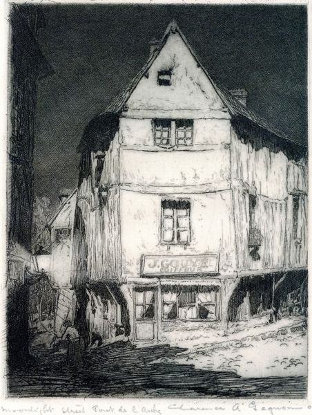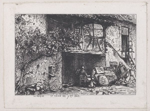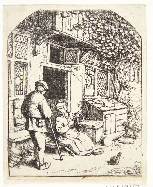 This is Jan Diederikus Kruseman’s etching "Gevel van een huis met een overdekte opgang". Kruseman was part of a generation deeply affected by social changes that included the abolition of slavery and the rise of industrialization, events that caused shifts in societal structure. Here, Kruseman gives us a glimpse into everyday life, focusing on a modest house with a covered entrance. At the forefront, a solitary woman stands, perhaps a resident or passerby, rendered with the same delicate attention as the architecture. The building seems to stand as a silent witness to these evolving social dynamics, a symbol of both stability and the quiet drama of ordinary lives.