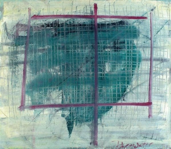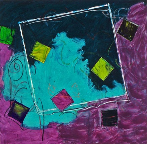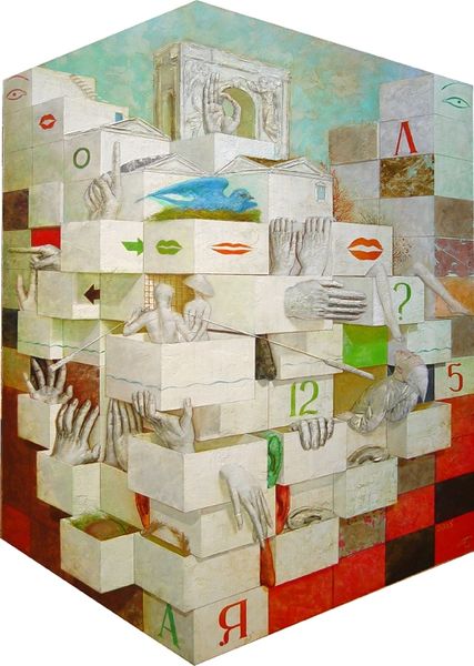 Curator: Looking at Guntis Strupulis' piece titled "Klusā daba," I'm immediately struck by its interplay between geometric structure and implied chaos. What grabs you? Editor: Well, first the red backdrop contrasting the black lower plane sets a theatrical stage. I find myself questioning, "What stories could be contained in the interplay between those vials, those stark frames, that vibrant background?" What about the artist’s process, specifically, informs this somewhat dreamlike stage? Curator: It's intriguing. This canvas, worked with oils, gouache, and possibly even acrylic paint, speaks volumes about experimentation with materials, right? I can imagine Strupulis wrestling with layering and transparency. It also forces me to consider questions of value - is the paint itself more 'important' than the form it renders? Editor: The red’s uneven, speckled finish and that severe contrast in light value further accentuate an almost harsh feel. So many art historical moments—De Stijl or Suprematism—spring to mind, especially when I examine how the depicted cubic shapes redefine notions of space. Given that artistic lineage, what can this artist teach us about the ongoing cultural fixation with these severe geometries? Curator: Good point! I think he reclaims some human touch that those movements strived to eliminate. The slightly imprecise lines making the forms prevent a sterile impression; in that regard, I would love to get a sense of the consumption of this aesthetic today. What venues showcased Strupulis’ work, and what messages did that pairing send to his audience about how it fit within larger cultural conversations about modern art? Editor: Agreed; understanding Strupulis' position in relation to his contemporaries is important. Perhaps Strupulis saw Modernism and other similar movements becoming relics; staging glass bottles within severe frames makes me think that he sought to recontextualize those ideas, presenting them almost like remnants found on a theatrical stage set long after the main production. Curator: Right! In that sense, one could propose this as an archaeology of forms and artistic heritage, reflecting on materials both physical, like the various paints he has deployed, and historical. It certainly enriches one’s understanding when approaching work like this in a contemporary setting, and is vital to any museumgoer or scholar looking for avenues to extend beyond the canvas in question! Editor: It indeed gives pause and asks, “What roles are our aesthetic tastes playing, right here, right now?” Something to ruminate over!