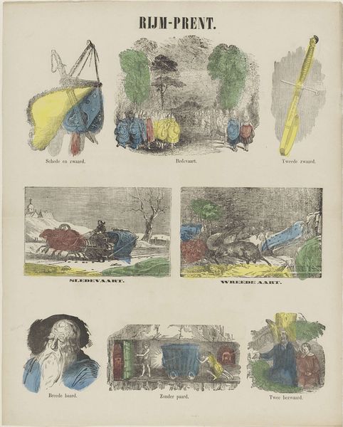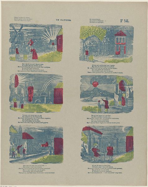 Curator: The print we're observing, entitled "De natuur," which translates to "The Nature," created between 1827 and 1894 by M. Hemeleers-van Houter, offers a fascinating example of 19th-century etching from the Rijksmuseum collection. Editor: It strikes me immediately as peculiar—almost childlike. The scenes are quaint, simple, and the colors are applied somewhat haphazardly, creating an almost dreamlike, folk-art quality. Curator: Precisely. The work uses etching as the medium for an unfolding tableau that attempts to encapsulate nature itself, offering fragmented scenes—cityscapes, windmills, genre paintings. Look how the limited color palette—primary tones mostly—further abstracts these vignettes. Each adds a unique texture and emphasizes shape. Editor: But consider the socio-cultural context. This would have been produced during a period of increasing industrialization and urbanization. Could these scenes represent a nostalgic yearning for a simpler, pre-industrial past? The windmill scene, in particular, feels deliberate in its positioning of nature and labor in harmony. Curator: A pertinent reading, indeed. The compositions, while simplistic, demonstrate effective contrast and perspective. The textures achieved through the etching—notice the linear detail in the buildings and the swirling energy of the windmill scene. The visual elements suggest how diverse, but harmonic nature can be. Editor: And what of the poems included? I imagine those provide crucial cultural context for contemporary audiences of the time; providing meaning to everyday scenes. Perhaps the print functions didactically, or as popular entertainment – considering the role and function is crucial for understanding this etching as cultural artefact. Curator: I'm particularly drawn to the middle row: the architecture and how the church towers become visual anchors against that vibrant yet almost menacing skyscape. This is a powerful application of form and line, suggesting how even industrial structures or cultural artefacts remain a component within nature, be that harmonious, or menacing. Editor: Looking at this piece again—armed with this dialogue and consideration for compositional qualities—highlights for me how public perceptions of nature can be constructed or idealized through mass media imagery of the time. Fascinating. Curator: Indeed. Studying Hemeleers-van Houter's work allows us to probe how basic, material elements interact within their composition and to then ponder the function such forms are given across societal stratifications of cultural and economic status. A powerful object!