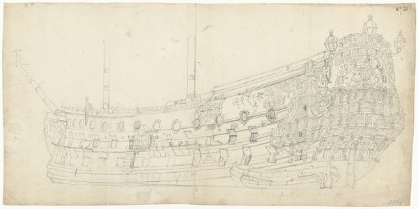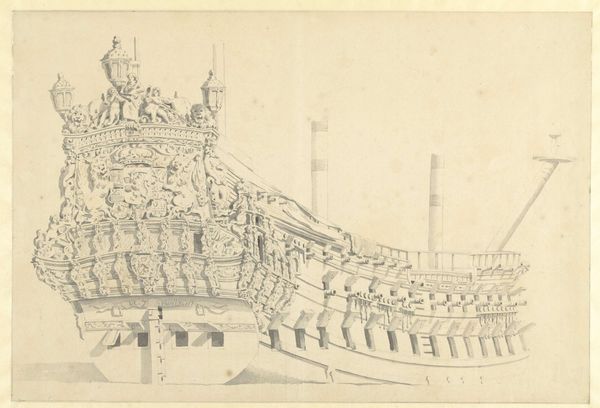 Editor: So, this drawing, “Partial Sketch of a Dutch Vessel Seen from Port Quarter,” is by Willem van de Velde the Elder, and it's done in pencil on paper. What strikes me is the level of detail, especially given the ephemeral nature of pencil. How can we approach a sketch like this? Curator: Considering van de Velde's detailed work, it prompts us to ask: What does this say about the production of ships and their importance? These vessels were significant for trade, warfare, and projection of Dutch power, and it is clear that their design and craftsmanship are meticulous. Editor: So, it is all about the economic power of the boat, what about the drawing being ‘partial’ and just a sketch. Curator: Precisely. The "partial" nature emphasizes its status as a study—a glimpse into the ship-building process and naval labour, before becoming the end-product: both object and the paintings Van de Velde and his son were famed for producing. This sketch collapses boundaries between art, craft, and the commercial activities tied to maritime culture, don't you think? Editor: Definitely! It reframes what we consider "finished" art, and places this material within the workshop where ships, and perhaps paintings were being designed and planned. It wasn't solely about aesthetics. Curator: Exactly, it highlights labour and material. I wonder how this sketch could lead us to think differently about how artistic value is determined or produced? Editor: It challenges our assumptions about value. I initially saw a drawing, now it feels more like a document of industry and design. Curator: Agreed. This examination of a “partial sketch” makes it clear that we’re talking about process and construction as social activity, it adds new value for the historical objects, right? Editor: Absolutely, it opens my eyes to valuing the artistic labor involved in what might seem like a simple sketch. Thanks.