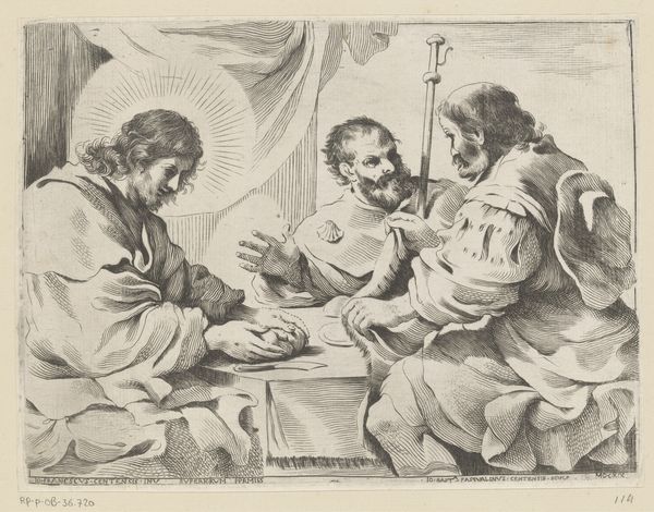 Curator: I’m struck by the sheer amount of labor invested in this print, “Christus en de cijnspenning,” made after 1620. The precision of the engraved lines! Editor: Immediately, I notice the composition—how the figures of Christ and his questioners are arranged. The gazes, the hand gestures—it’s a moment of profound moral and political challenge frozen in time. Curator: Absolutely. Looking at the materials, the artist worked in engraving. You can see the incised lines created to hold the ink when printed, and they had to think in reverse when designing the plate. The choice of a reproducible medium would also speak to a desire to broadcast the subject matter broadly. Editor: And what a subject! This is the famous “Render unto Caesar” passage from the Gospels. Christ is being questioned about the legitimacy of paying taxes to Rome. It's about resistance against imperial powers. Considering the role of religion and class in social control, I wonder, how was it received? Curator: That is difficult to assess precisely, but this print makes me consider the accessibility that prints allowed and the implied audience and its relationship to religious teachings. Who owned it? Who reproduced it? Was it political or primarily didactic? Editor: Didactic perhaps, but inextricably political too, then and now. The issues it raises—authority, obligation, faith versus state—are evergreen. Look at the faces: The men questioning Christ appear sly, anxious. In contrast, Christ looks so serene but resolute, challenging earthly authority. Curator: The details in clothing and drapery show skill too, the way the light catches different planes, and what these details communicated to viewers then: class, occupation. And the subtle shift of the hand! How easily we lose sight of that process. Editor: It is about power, about pushing back, especially powerful because it uses a now seemingly traditional image that we must always continue to see with fresh and historically attuned eyes. Curator: That is why it remains impactful, I think, this intersection of careful craft, wide distribution and these powerful biblical narratives.