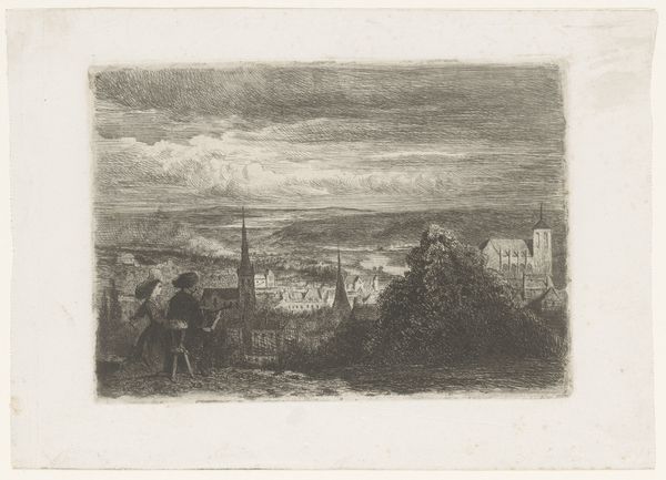 Maria van Hohenzollern-Sigmaringen made this delicate etching, titled 'View of a Mountain Village', sometime in the late 19th or early 20th century. As a member of the German aristocratic family, Hohenzollern-Sigmaringen, and by marriage, Countess of Flanders, Maria had a deep connection to the socio-political structures of her time. The etching depicts a quiet village scene dominated by a church, a symbol of communal life. The village, nestled within a mountainous landscape, suggests a somewhat isolated community, perhaps resistant to outside influences. While seemingly benign, scenes like this served to reinforce societal norms and values. This kind of landscape art promoted a sense of national identity and cultural heritage, reinforcing the existing social hierarchy. Understanding the context of artistic production is crucial in art history. Maria van Hohenzollern-Sigmaringen's position as a Countess provides insights into the cultural values she represented and the intended audience for her work. Researching the patronage systems, art academies, and exhibition venues of the period might reveal how this artwork was situated within the art world of its time.