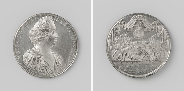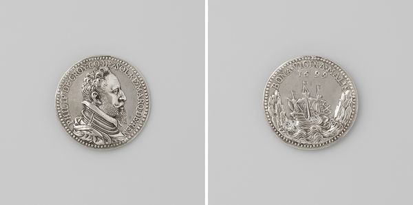 Editor: This is a Renaissance relief from 1585 by Jacques Jonghelinck. It seems to be carved from metal, and depicts the Erezuil erected for the Duke of Parma. It’s presented in two-sided format, kind of like a coin. The piece feels... official, almost cold. What do you see here? Curator: Ah, yes, the icy touch of power! You've hit upon something vital. Consider it as not just metal, but a deliberate casting of history itself. A snapshot of victory, wouldn't you say? Look how meticulously the artist renders both the Duke’s strong profile on one side and the triumphal column on the other. The coin's material lends it this… enduring quality. Almost as though saying, "This victory? This is permanent." Does it make you question whose version of the story we're being sold? Editor: Definitely. I noticed the laurel wreath on the reverse side too – more symbols of victory, right? It’s interesting how insistent it is. And it almost feels propagandistic. Were these types of objects commonly circulated? Curator: Precisely! Circulated, yes, but perhaps more importantly, *controlled*. They served as pocket-sized billboards, solidifying power in tangible ways. What strikes me, though, is Jonghelinck's technical skill. Feels he's trying to trap history into perfection. Think of the lives behind this piece, the cost! Doesn't the coldness feel like the price of that perfect moment in time? Editor: It really does change how I see it now. It is very intentional! The artist almost wants you to feel something through propaganda, whether or not it is ethical. Curator: And now you start thinking, how differently would a civilian at the time interpret such a coin? That gap, that friction between intended message and received message… that’s where the real art history often resides, wouldn't you say? Editor: Absolutely. Thanks, that makes a lot of sense!