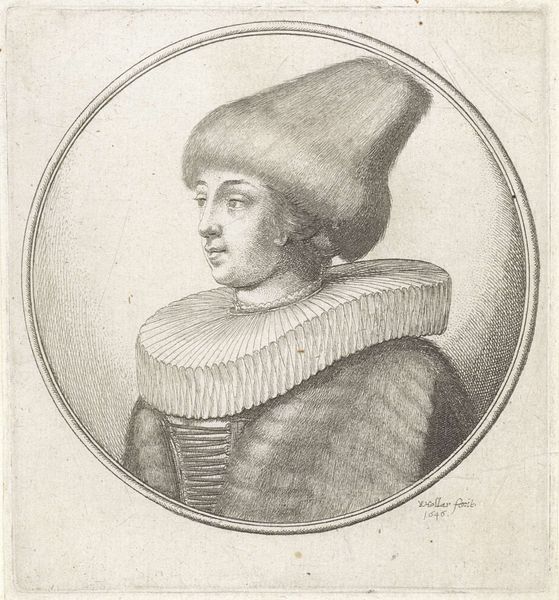 Curator: This engraving, "Woman with a Millstone Collar and Large Fur Cap, in Profile," was created in 1642 by Wenceslaus Hollar. Its detailed lines and Baroque style are truly remarkable. Editor: My first thought? This woman looks profoundly constrained, almost entombed, by her collar and that massive cap! There’s something very unsettling about the image despite the detail. Curator: The image relies heavily on line and texture to create depth and volume. Notice the contrast between the smoothness of her face and the density of the lines forming the fur. It is quite sophisticated formal composition within that stark circular frame. Editor: But look at that collar—the historical significance of these enormous, restrictive collars can't be ignored. The artist is presenting an upper-class woman, quite literally boxed in by expectations of her social standing. Curator: Perhaps. Yet, consider Hollar’s technique—his mastery of etching is clear in the variations of line weight. Look how he manages to use hatching to create the illusion of roundness in the face and the subtle gradations on the fabric. The work creates the subject by manipulating contrast to produce tonal range from black to white in perfect harmony with its round frame. Editor: I still can’t escape how oppressive it all feels. That elaborate fur hat—is it meant to denote status, or is it another gilded cage? Women of privilege throughout history have often been suffocated by societal expectations. Hollar subtly captures her forced compliance, it seethes under the surface. Curator: It's tempting to read psychological narratives into these portraits, but Hollar likely focused more on documenting the fashions of the time and showcasing his own technical abilities. See how the circular composition frames the subject perfectly. Editor: Fashion always speaks to social constraints, whether the wearer realizes it or not. And this woman’s almost complete lack of agency over how her identity will be displayed to the world can also tell us something, no? The way her expression looks vaguely unhappy? Curator: A fair assessment. Nonetheless, studying the details—the skill demonstrated with line and form is instructive from purely formal perspectives. Editor: And by recognizing the complex historical contexts embedded within even the simplest-seeming portraiture, we can foster discussion about its function within our lives, our stories and beliefs about that past. Curator: Ultimately, Hollar’s print presents a technically masterful and formally striking portrait. Editor: Indeed, the very construction of this image, when viewed critically, reveals far more about the society and expectations surrounding its subject than initially meets the eye.
