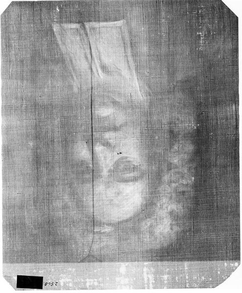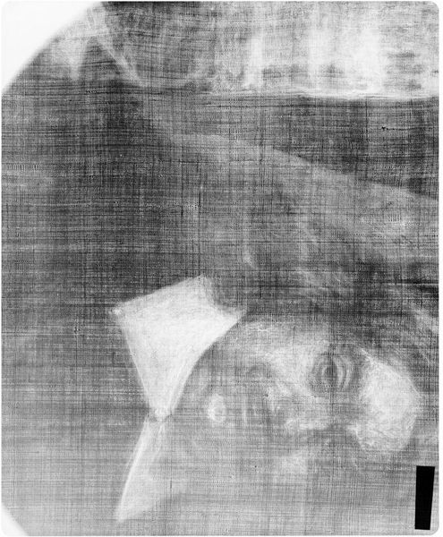 Curator: This is an X-radiograph, about 14 by 17 inches, of "Head of Old Man," believed to be from the hand of Jan Adriaensz. van Staveren. Editor: It's like looking into the soul of the painting! The skull beneath the surface...it's a memento mori in grayscale. Curator: Yes, radiography unveils the hidden layers. It lets us study the artist's process, corrections, maybe even earlier compositions. Editor: This reminds me of the traditional Vanitas paintings and their exploration of mortality. The X-ray itself becomes a potent symbol. Curator: It does recontextualize it. We are not just seeing a portrait, but an exploration of time, decay, and memory, captured on film. Editor: I’m left feeling as though I’ve caught a glimpse of something sacred—a visual poem about the passage of time.