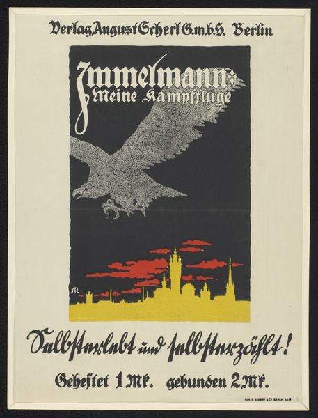 This is a poster, a Reclamebiljet, made in 1917 by an anonymous artist, promoting a book called "The Red Battle Flier." Look at that mustard yellow! It's like the color of old paper, but brighter, almost aggressively cheerful, a really strange backdrop for an image of war. The plane is a bright, saturated red, and seems to fall through cartoon clouds. Then there's this smear of dark grey indicating a downed plane in the distance. It’s kind of amazing how they managed to create this strange sense of depth using such flat, graphic elements. The design feels so immediate, like it was dashed off in a hurry, yet there’s a real tension between the quick, almost slapdash execution and the somber subject matter. Think about the context: World War I, propaganda, and the glorification of a war hero. What does it mean to have such a heavy message delivered with such a light touch? It reminds me a bit of the work of Lari Pittman, with its juxtaposition of bright color, graphic imagery, and dark subject matter. Art is always talking to art; it’s a long, ongoing conversation!