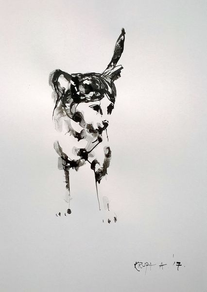 Editor: Here we have "Bruno," an oil painting from 2020 by Dragan Ilić Di Vogo. It's definitely a quirky portrait. The dog looks like he’s gazing at something amazing, and the surreal elements create a playful mood. What strikes you when you look at this? Curator: I'm interested in the material aspects here. Notice how the oil paint is applied—it’s not just about depicting the dog, but also about the visible layering and texture of the medium itself. The 'planets,' the blue square... they feel almost like applied stickers. How does the artist’s choice of these distinct, almost manufactured shapes impact our reading of the subject, the dog 'Bruno'? Editor: So you're focusing on the production process itself and how the artist treats the paint? Curator: Exactly. I see a deliberate blending of traditional portraiture with something…industrial. What’s the dog sitting on? The material itself looks rough, almost like solidified drippings, opposing the smoothly painted planets. Does the choice of materials or their application feel in line or at odds with, say, the subject’s "dogness?" And then, is the painting actually "finished"? Editor: That's a good question! The unfinished aspects, like those drips, do bring up questions of value, and what’s considered "done" in art. Curator: Furthermore, think about consumption: pet portraits are often commissions or gifts, embedded in complex economic relationships and the emotional ties that bind. How does Di Vogo acknowledge—or subvert—these expectations through their use of material and technique? Is it challenging traditional portraiture by focusing on method? Editor: I see your point. The work is less about pure representation and more about revealing the artificiality inherent in the process, challenging our traditional appreciation. Thank you! Curator: My pleasure. Looking at art through the lens of its production always provides interesting insights!