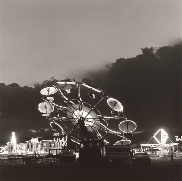Robert Adams made this photograph, Weld County, Colorado with gelatin silver. The silvery grays feel so deliberate, like he’s painting with light and shadow to find a certain kind of sublime—one that’s quiet and a little unsettling. Adams isn't afraid to embrace the starkness of the scene. The two floodlight poles cut right through the composition, making these bright verticals against the muted landscape. I am drawn to the way the light pools at the base of the poles, creating a flat, almost geometric shape that contrasts with the more organic forms of the field. It's like a stage, the way the light renders everything so plain, like the paintings of Edward Hopper. Both are holding a mirror up to the ordinary. It's the strange beauty of art, to notice the mundane and ask us to see it too.