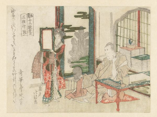 Editor: Here we have Teisai Hokuba's print, "Zhuangzi from the series 'Shunshoku ressenkyo,'" created sometime between 1801 and 1818. There's an intimate feel to the piece, almost like we're intruding on a private moment. What strikes you when you look at it? Curator: Immediately, the question of viewership comes to mind. Ukiyo-e prints, especially those depicting women in domestic settings, were often produced and consumed within specific social strata. The depiction of leisure and refinement, even in this seemingly "private" setting, signals certain societal values and class aspirations. Does the woman's placement mirror the man's? Editor: Good point. She's partially obscuring him. What do you make of their relative positions within the frame? Is she rejecting him, is she an aide, a distraction from the reading, or perhaps representative of other types of commentary in the political world. Curator: Her apparent distraction, contrasted with the scholarly pursuit of the male figure, taps into established gender roles. Prints like these, distributed widely, reinforced or challenged these social norms, sparking conversation about what it meant to be a learned man or woman in Japanese society. Who were the buyers of this print? That shapes interpretation. The imagery serves specific purpose within that society. Editor: That's fascinating! I never considered how the circulation of these images played such a crucial role in shaping social dialogues around gender and class. The narrative shifts dramatically knowing the social context. Thank you for bringing that point. Curator: Precisely! That interplay between artistic representation and societal reception is key to understanding art history. By focusing on social status within art it makes history even more vivid.