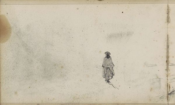 Curator: Willem Bastiaan Tholen created this pencil drawing, titled "Vrouw met een kap en schort, van achteren gezien," sometime between 1870 and 1931. It’s currently held at the Rijksmuseum. What’s your immediate impression? Editor: Well, immediately I'm struck by its... economy. Such delicate, sparse lines used to suggest form and presence. There's a quietness about the composition, a solitude emphasized by the blank space surrounding the figure. Curator: I agree. The restrained linework serves to distill the essence of the subject. Notice the structural balance achieved with so few strokes; the verticality of the figure grounded by the implied horizon line, subtly indicated by the change in tone toward the bottom of the paper. Editor: But I think there’s more than just structure here. Consider the social implications – a woman in modest dress, seen from behind. It speaks to the anonymous labor often performed by women, their contributions rendered invisible in a patriarchal society. Curator: An intriguing point. From a purely formal perspective, the averted gaze invites the viewer to complete the narrative, to project their own understanding of the woman's interiority. Semiotically, her dress could be seen as a signifier of her role. Editor: Precisely! Her averted presentation makes her a symbol, less of an individual and more representative of a whole class of women. One wonders about Tholen's intentions. Was he aiming to highlight their plight? Curator: Difficult to ascertain intentions with such a simple sketch. The beauty of the piece also lies in its incompleteness, the way it activates the viewer's imagination. The materiality of the pencil marks on paper, the visible texture—these all contribute to its profound effect. Editor: Agreed. I am now reflecting on its public role and presentation within the Rijksmuseum, prompting critical discussions regarding social equity and historical representation within fine art institutions. Curator: Indeed, this subtle drawing opens up layers of artistic considerations, from pure form to potent narratives. Editor: Leaving us to reconsider those seemingly quiet, invisible parts of our shared cultural heritage.