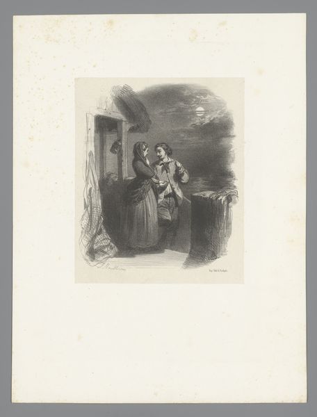 Editor: So, here we have "Man en vrouw zitend bij kind in bed," or "Man and Woman Sitting by Child in Bed," a pencil drawing made sometime between 1823 and 1873 by Célestin Nanteuil. It has a definite sentimental feeling. What kind of narrative do you think Nanteuil is trying to convey, and how does it fit within the context of art at that time? Curator: Well, considering this piece was produced during the Romanticism movement, its sentimentality is hardly accidental. Genre paintings like this gained popularity as ways to express moral or social values accessible to a wider public. Nanteuil uses the intimacy of the family, centered on a sick child, to perhaps evoke compassion and concern. Does the modest setting give you any indication about the values represented here? Editor: Definitely. The simplicity suggests that genuine feeling isn’t dependent on wealth or status. Is it common for artists of that era to choose domestic scenes to convey such sentiments? Curator: It’s quite common. The rise of the bourgeoisie brought with it a fascination with domestic life. But beyond just representation, consider how this image might *shape* societal expectations around family roles, women's duties as caregivers, or the sanctity of childhood during times of higher infant mortality. Think of how these images might serve as silent lessons. Do you find this composition emotionally manipulative, or simply representative of its time? Editor: I see what you mean about 'silent lessons.' It could easily be viewed as sentimental, maybe even a little manipulative to tug at heartstrings, but you’re right, that says more about my 21st-century perspective. Thank you! Curator: And thank you for your astute observations. This kind of exchange really brings the historical context to life, doesn't it?
