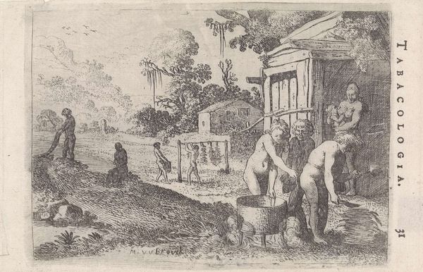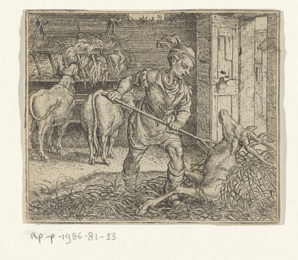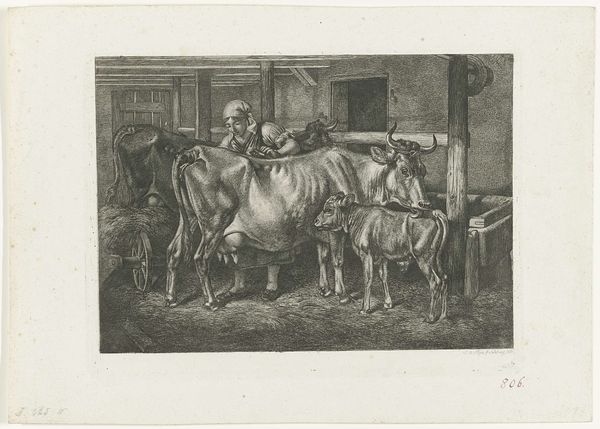 This etching, *Koeienstal met melkmeid*, was created by Théodore Wynant Stallenbergh sometime in the 18th century. It depicts a milkmaid inside a cowshed, going about her daily work. In the 1700s, class divisions were stark, and rural labor was romanticized by the elite while being a harsh reality for many. Consider the milkmaid in this image: she is not idealized, but shown in the midst of her labor. Her social standing is evident in her simple dress, and her occupation is essential yet undervalued. The cowshed itself, with its dark, cramped spaces, speaks to the conditions in which she worked. Stallenbergh captures the quiet, unglamorous aspects of her life. This image isn't just a scene; it’s a glimpse into a life shaped by labor, class, and the everyday realities of 18th-century rural life. It invites us to consider the stories of those whose lives were defined by their work.