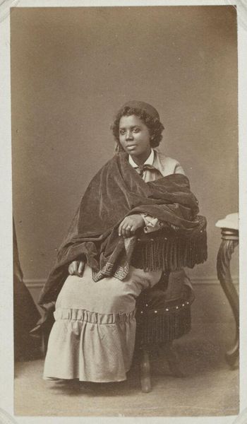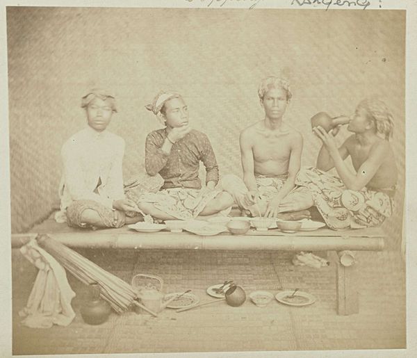 This photograph titled, Toppeng, was created by Woodbury & Page, its date is unknown. The sepia tones cast the figures in a timeless tableau. The composition, framed by an oval vignette, focuses our attention on the subjects: musicians and a central female figure, possibly a dancer. Note how the photographer has arranged the group to create a balanced, almost symmetrical form. The textures are rich and varied; from the smooth column on the left to the intricate garments and musical instruments. The formal arrangement invites a semiotic reading. The column, a signifier of Western architecture, contrasts with the indigenous clothing and instruments. The symmetry implies a structured performance, perhaps ritualized. It also suggests power dynamics; the central figure stands elevated, while the musicians are seated, creating a visual hierarchy that speaks to social roles. The monochromatic palette unifies these elements, yet the composition’s underlying tension points to a complex interplay between cultural representation and artistic form. It is a visual dialogue between the observer and observed, rendered in tones of brown and white.