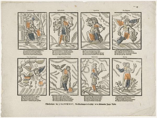 Editor: Right now, we're looking at "Deze prenten mooy en wel / Zijn 'er zestien op een vel", an engraving printed between 1725 and 1780, by Johannes (II) Kannewet. It’s a collection of somewhat crudely drawn animals, all crammed onto a single sheet. I get a really strong folk art vibe, almost like something a kid might draw. What catches your eye in this piece? Curator: Ah, yes! It whispers of market stalls and well-worn chapbooks. What grabs me is the sheer exuberance! It's almost as if the artist, dear Johannes, had a bet on how many creatures he could cram onto a single page. Do you see the faint, almost haphazard dabs of color? They remind me of childhood coloring books, slightly off the mark, wildly enthusiastic. It transforms these beasts from mere depictions to little splashes of narrative, doesn't it? What stories do they tell you, do you suppose? Editor: I hadn’t really thought about the color like that, as hints of stories! I was focused on how basic the animal depictions are. Does this level of folk art, for lack of a better term, mean this wouldn’t have been “serious art” at the time? Curator: A marvelous question! “Serious art” is such a fickle phrase, isn’t it? While these may not have graced the halls of the elite, their value lies in their accessibility and connection to everyday life. These were images for the masses, bursting with playful didacticism and humble charm. I imagine they decorated many a cozy home. The directness, almost like a visual shorthand, gives it such a delicious feeling, don’t you think? Editor: Definitely something special about it! I think I better understand its appeal. Thanks! Curator: The pleasure was entirely mine. It has truly changed my views of animal representations and its power to show folk's representation of their surroundings.