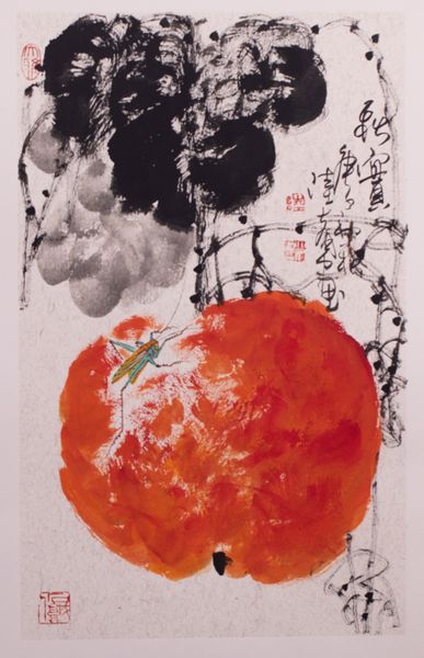 Editor: This is Mary Fedden's "Fritillaries," currently held at the Tate. It's a print of a still life, but with a surreal twist. What do you make of the symbols and composition here? Curator: The still life evokes a symbolic language through the ages. A red orb—sun or moon—watches over the scene, while the fritillaries might suggest transience. The checkerboard pattern on the blooms, what could that evoke? Editor: Perhaps the fragility and instability of life? Curator: Precisely! Fedden uses recognizable imagery to tap into deeper cultural associations. The butterfly, too, could represent transformation. How do these symbols resonate with you? Editor: It’s fascinating how everyday objects can hold so much cultural memory. Curator: Agreed. Fedden masterfully weaves personal expression with universal symbolism.