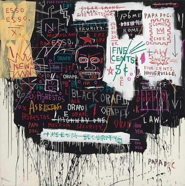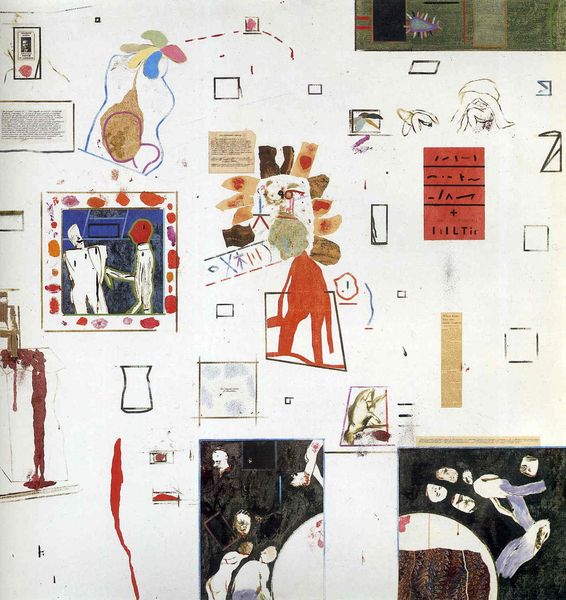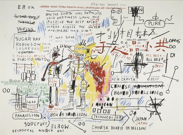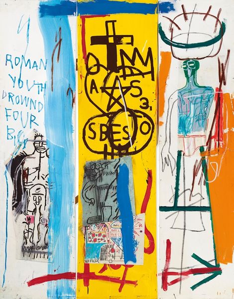 Curator: We are looking at Jean-Michel Basquiat’s 1987 piece, "Riddle Me This, Batman," a mixed-media work that pulsates with frenetic energy and complex cultural references. Editor: Oh wow, what a whirlwind! My first thought? Chaotic carnival. There’s a darkly playful, almost manic energy bouncing right off the canvas. Like a clown juggling existential dread. Curator: Indeed. Basquiat often employed such seemingly disparate elements. The inclusion of Batman’s villains, the Riddler and the Joker, juxtaposed with his signature crown and textual fragments, presents a powerful commentary on comic book narratives versus the realities of marginalization and power structures. Editor: Absolutely! Those repeated “HA HA HA” sequences become almost sinister. It's not just laughter, it's mocking, echoing the hollow amusement within oppressive societal constructs. Then that defaced Joker… haunting. Curator: Precisely, the almost manic scrawling of words like "cowards will give to get rid of you," combined with seemingly nonsensical diagrams and equations, hints at Basquiat’s interest in deconstructing language and systems. Editor: The raw expression reminds me of a child’s primal scream against a world they don’t quite understand, but feel deeply nonetheless. You know, maybe those diagrams AREN'T nonsense to him. Maybe he was just letting us glimpse inside of that wild mind of his. Curator: This painting serves as an interrogation of those self-referential artistic tropes that are always visible when reading Basquiat's work and an effort to expose cultural mythologies for what they are and their profound contradictions. Editor: Seeing that raw honesty laid bare… it’s humbling. You’re faced with so many things at once, social commentary and also, something so deeply personal that just explodes outward. Curator: I find that even though on the surface the painting seems erratic and disorganized, it really expresses and analyzes systemic issues within race, class, and social hierarchy, exposing a truth that may not be visually pleasing. Editor: In the end, though, doesn't it push you beyond just the visual experience into something visceral and genuinely unsettling?