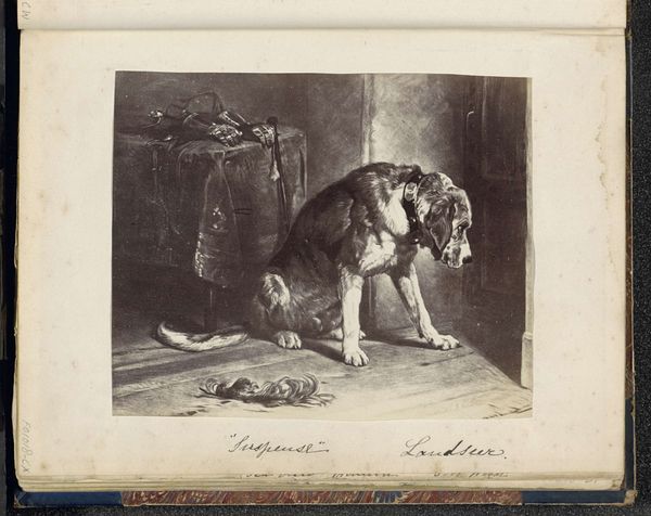 Curator: Here we have "Sleeping Bloodhound" by Thomas Landseer, dating back to the 19th century. Editor: It immediately strikes me as rather melancholic, this weary hound slumped on what looks like a fur rug. The monochrome palette reinforces that somber mood. Curator: The details certainly contribute to that feeling. Note the helmet and what seems to be a dog house in the background. Perhaps they represent duty and domesticity, abandoned in this moment of repose. Editor: And look at the texture! Landseer must have spent ages capturing the feel of the fur, the metal of the helmet. It speaks to a society where even leisure was meticulously crafted. Curator: True. Bloodhounds were often symbols of loyalty and vigilance. Seeing one asleep challenges those associations, perhaps reflecting anxieties of the time. Editor: It's fascinating how the arrangement of these specific objects and the choice of rendering contribute to such a complex representation of labor and leisure. Curator: Absolutely, and it’s this tension between ideal and reality that makes Landseer’s image so compelling. Editor: A somber, but beautiful glimpse into another time.