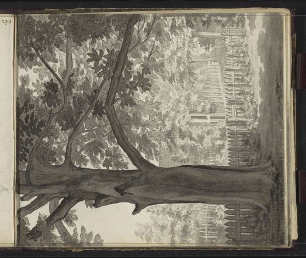 Curator: This is Thomas Gainsborough's, Wooded Landscape with Cows beside a Pool, Figures and Cottage, now held at the Tate. Editor: It has a quiet, almost dreamlike quality to it, doesn’t it? The composition, the limited palette – it all contributes to a very peaceful mood. Curator: Indeed. Gainsborough, known for his portraits, also often explored landscape, engaging with the rural economy through images of laborers and livestock. This drawing offers insight into his process, using white chalk on brown paper. Editor: The texture of the chalk really brings out the roughness of the bark and the softness of the foliage. And how he uses the brown paper as a mid-tone! Curator: Precisely. Gainsborough blurs lines between observation and artifice, depicting an ideal of rural life and labor that arguably wasn't the reality for many. Editor: It's a lovely example of how close attention to formal elements can conjure an emotional response, despite, or perhaps because of, its social context. Curator: Absolutely, this drawing provides rich material for understanding both Gainsborough’s artistic skill and the era's complex view of the pastoral.
