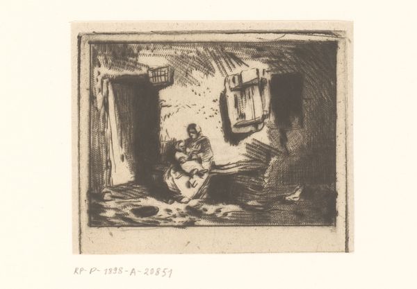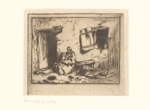 Editor: Here we have Charles Jacque's "Vrouw met kind op een bank tegen een gevel", an etching on paper from 1843. It's quite a small work, and the intimacy of the mother and child is so apparent even though the details are somewhat obscured by the etching style. What stands out to you about this image? Curator: It’s fascinating to consider this image within the context of 19th-century French society. Genre scenes like these, depicting everyday life, were becoming increasingly popular, offering a glimpse into the lives of the working class. How does the setting, specifically the rough facade behind the mother and child, inform your understanding? Editor: It definitely makes me think about the hardships of the time, suggesting maybe a life of poverty or simply a more rustic existence. The backdrop contrasts so starkly with the tenderness between them. It gives the image more depth, wouldn't you say? Curator: Absolutely. Artists like Jacque played a crucial role in shaping the visual narrative around family and social classes. The institutional support, or lack thereof, also dictated who could create and circulate such imagery. Were these images intended to be sympathetic portrayals, or something else entirely? Editor: I think maybe it depends on the viewer. It could be either, right? A well-to-do person might look at this and feel sympathy, while someone of the same social class might see it as just everyday life. Curator: Exactly! The power of art resides in its ability to evoke diverse responses, reflecting societal biases and ingrained expectations. Looking back, we see how the proliferation and presentation of similar imagery has shaped social consciousness about mothers, children, and class. What do you take away from that, thinking about today’s image landscape? Editor: It's definitely made me more aware of how the media frames our perception of these groups, even today. Curator: Precisely! And understanding the historical precedents allows us to critically assess the images we consume daily.