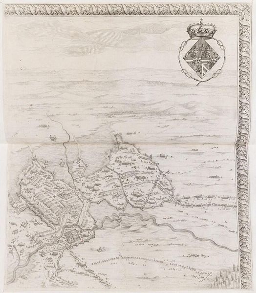 Curator: Jacques Callot, born in 1592, presents a stark vision in his work, "Siege of the Citadel of Saint-Martin on L'Ile de Re." The piece resides at the Harvard Art Museums. Editor: It's just...a bird's-eye view of organized chaos! So many perfect, grid-like structures under siege, it feels like a painting about the futility of order. Curator: Indeed. Callot masterfully employs the etching technique to convey both spatial depth and the intricate details of military conflict. Note the meticulous rendering of fortifications and the sea. Editor: The way those meticulously etched lines create a sense of both vastness and claustrophobia is unsettling. Like the ocean is a character, bearing down. Do you feel that? Curator: The composition reflects a structured approach, evident in its meticulous rendering and geometrical layout, aligning with prevalent cartographic and military aesthetics of the period. Editor: It's a powerful reminder of the human cost buried beneath strategy. For me it conjures thoughts of sandcastles, fleeting power, and the sea’s indifference. Curator: Very interesting. It is a poignant juxtaposition of precision and the unpredictable nature of conflict. Editor: Absolutely, making this work so much more than just a historical document. It whispers to something deep inside us.