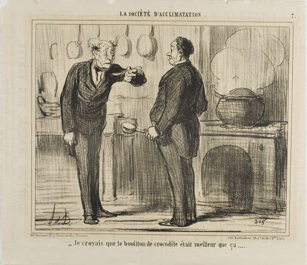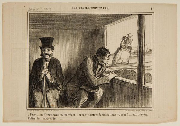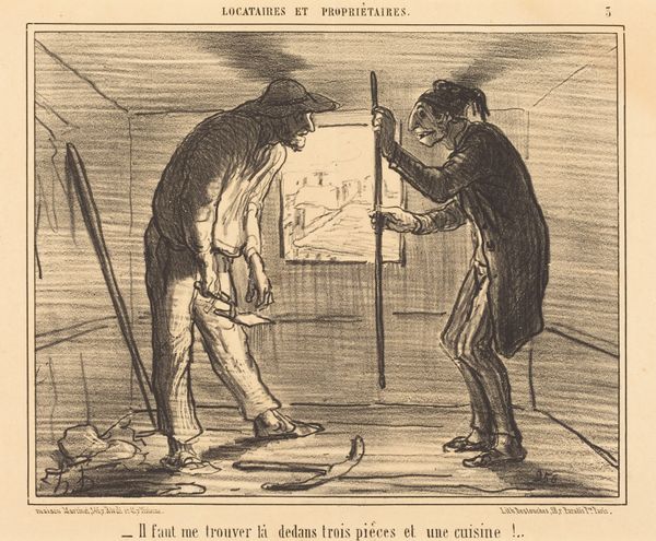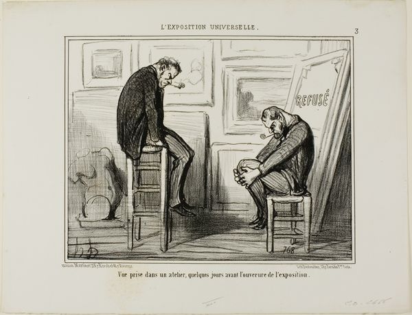 Editor: This lithograph, "Vue prise dans un atelier…", roughly translated as "View Taken in a Studio...," comes to us from Honoré Daumier in the 19th century. I find the dejected mood really striking – both figures seem crushed. What do you see in this piece? Curator: Beyond the immediate feeling of disappointment, I see a powerful commentary on the art world and its gatekeepers. Consider the context: Daumier was working in a time of rapid industrialization and social change, with the Salon system wielding immense power. What do you think the word "Refusé" scrawled on one of the canvases implies about this power? Editor: It suggests a very arbitrary power to make or break an artist’s career, regardless of talent! Almost a critique of the selection process? Curator: Precisely. Daumier, through his caricatures, often critiqued the bourgeois values and institutions of his time. The slumped postures and darkened faces could represent the countless artists who faced rejection, their voices unheard amidst the clamor for academic approval. Notice how the setting itself, a cramped studio overflowing with canvases, underscores the oversupply of artistic aspirants versus available validation from official institutions. Where do you think Daumier situates himself in this debate? Editor: He definitely seems to side with the artists, using his art to call attention to the stifling effect of the Salon on creativity and innovation. Curator: Absolutely. Daumier used lithography, a then-modern printmaking technique, to disseminate these ideas widely. It wasn't just about making art; it was about making a statement and sparking conversation. What do you take away from our chat? Editor: I'm realizing how much the social context influences how we see a piece. The visual language really does underscore the commentary he's making about art institutions. Curator: Indeed. Understanding the historical framework reveals the potency and social significance of Daumier’s observation.