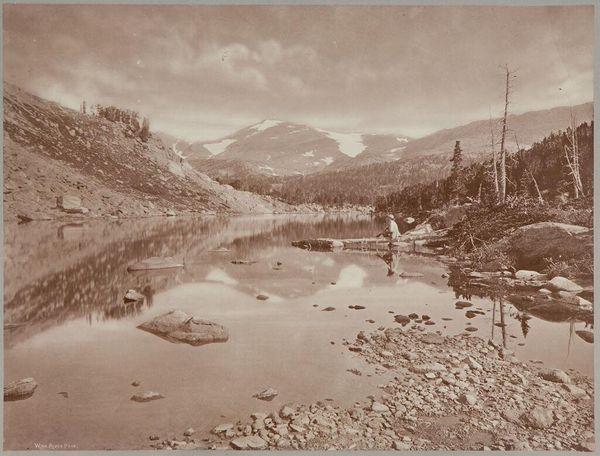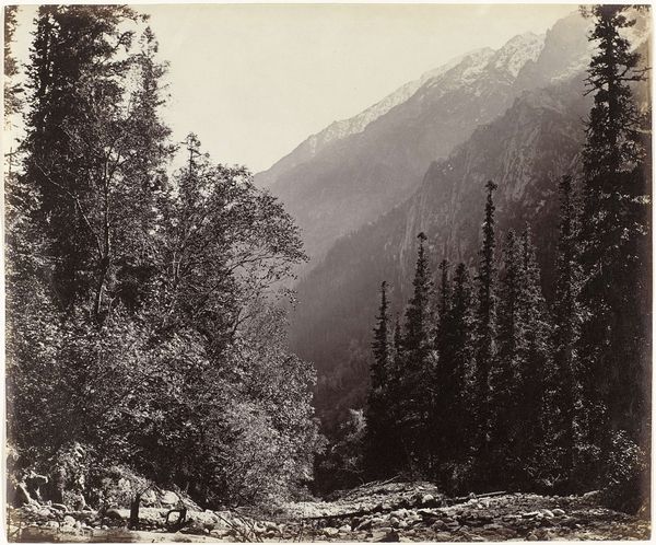 Curator: This is Samuel Bourne’s photograph, "The Ganges at Derali; Buspa Valley, Gangootri." Editor: It feels immense, but also still somehow. The tones are so muted, yet the scale of the mountains surrounding the river is impressive. Curator: Bourne made a career of photographing the Himalayas, and this image typifies his project of visually mapping colonial India. Editor: I think it's crucial to also consider how Bourne's work, like much colonial-era photography, participated in the objectification and appropriation of landscapes and cultures. Curator: Indeed, the sublime landscape becomes a resource, a subject for the colonial gaze. The act of photographing itself has social consequences. Editor: Right, seeing this image today, we must ask how it both reflects and reinforces power dynamics. How does it shape perceptions of India? Curator: Understanding this shifts our viewing, allowing us to consider the complex narratives embedded within this seemingly serene image. Editor: Exactly. It is beautiful, but beauty can obscure histories, and the camera, after all, is never neutral.