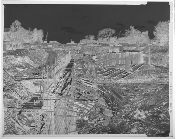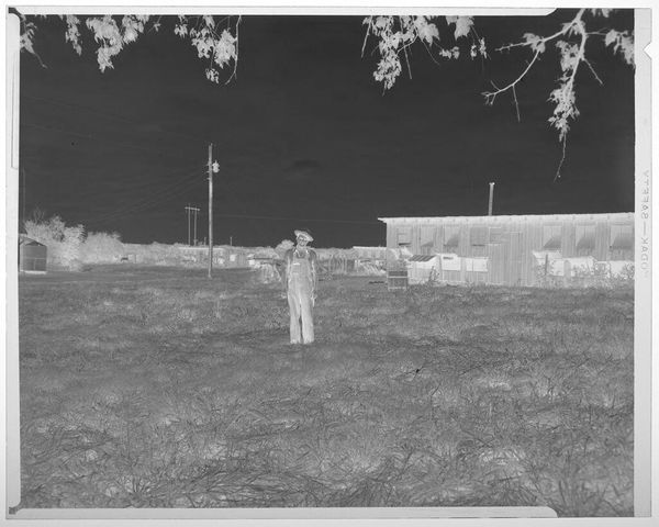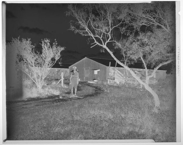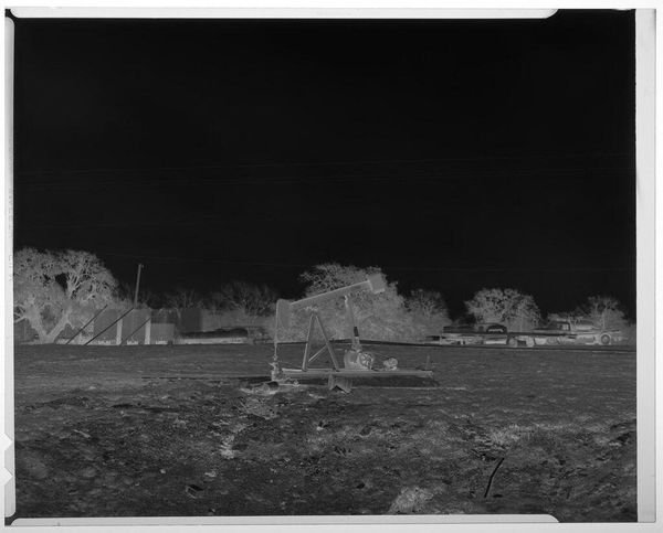 Curator: This is an untitled photograph by Harry Annas, part of the Harvard Art Museums collection. It depicts a field with buildings, specifically the Armo Mills Broiler operations. Editor: My initial response is of stark contrast; the inverted tones create a sense of unease and desolation. Curator: Absolutely. Annas’s choice to document the Armo Mills Broiler operations raises questions about labor, consumption, and the industrialization of agriculture. The materiality of the image itself, a photographic negative, speaks to a process of revealing hidden aspects. Editor: I’m intrigued by how the inverted tones emphasize the skeletal structure of the trees, almost as if the photograph is dissecting nature’s own architecture alongside the industrial presence. Curator: Perhaps this negative process serves as a stark reminder of the hidden costs associated with these operations. Editor: Indeed, the visual contrast makes us reflect on the environmental impact and the labor involved in the broiler industry. Curator: It certainly provides a new perspective on the socio-economic context of this rural landscape.