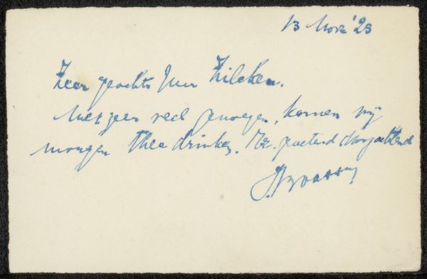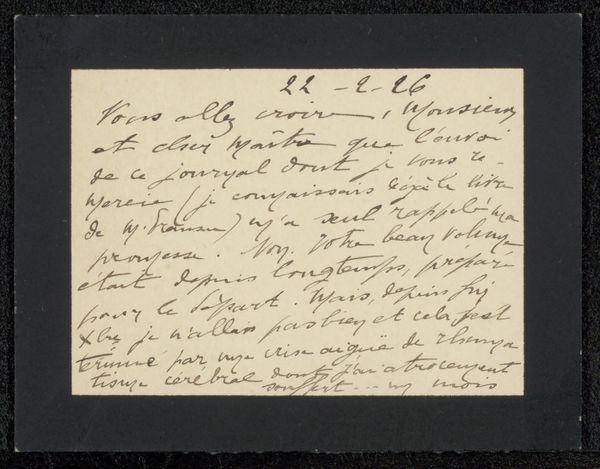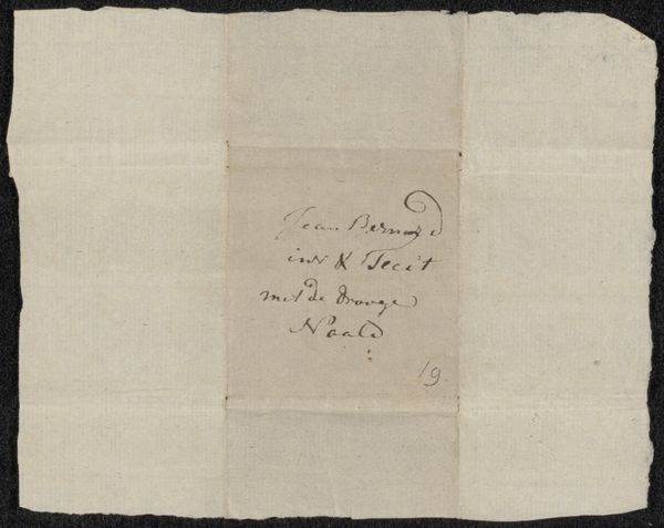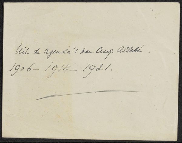 Editor: This is “Envelope, Possibly of Marie Jordan,” dating to about 1876. It appears to be an envelope with some handwritten text in Dutch. It’s small and intimate. What does this fragment tell us about the cultural context of its creation and preservation? Curator: Considering its function, we should think of it not merely as art but as an artifact that enables us to engage with 19th-century social history and institutional practices surrounding photography and personal memory. How was it originally circulated and eventually preserved? Did it travel through the postal service, a form of relatively new infrastructure, to reach its addressee? Editor: That’s fascinating. I hadn't thought of the postal service as part of the picture. Curator: Think of the sender's role. We read here a note "Portrait of my beloved mother," revealing both the intimate personal aspect, as well as a visual means to mediate an evolving culture. Was photography an evolving social practice to deal with death and remembrance in middle-class Dutch society at the time? What power dynamics were at play in controlling this dissemination? How might museums inadvertently amplify such power dynamics by giving it recognition in contemporary culture? Editor: I suppose these are important questions when displaying a work with such a potential private connection, because otherwise it turns into something removed from its cultural setting. Is there a sense that keeping the work and respecting it could almost revive those original political settings, despite us wanting to just see the art? Curator: Precisely! Our awareness, in the context of display and preservation, should serve as an honest acknowledgement of its cultural setting, even with the passage of time. This helps preserve its meaning responsibly. Editor: This gives me so much to think about when encountering similar pieces in museum collections.